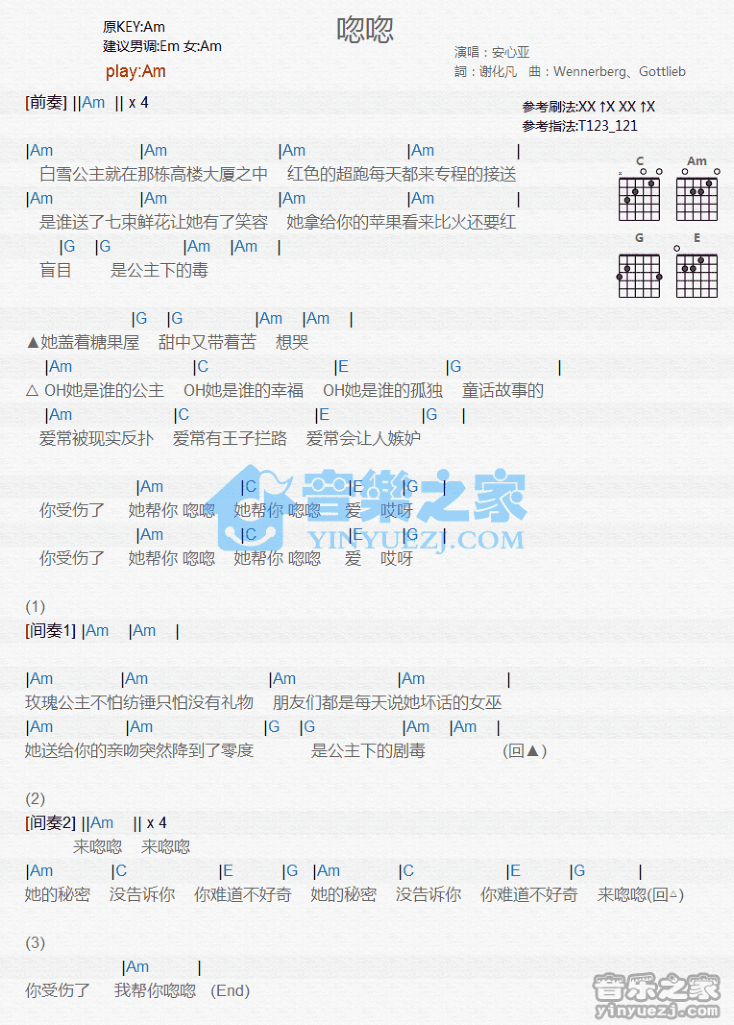 曲谱介绍: Am调版安心亚《呼呼》吉他和弦弹唱谱