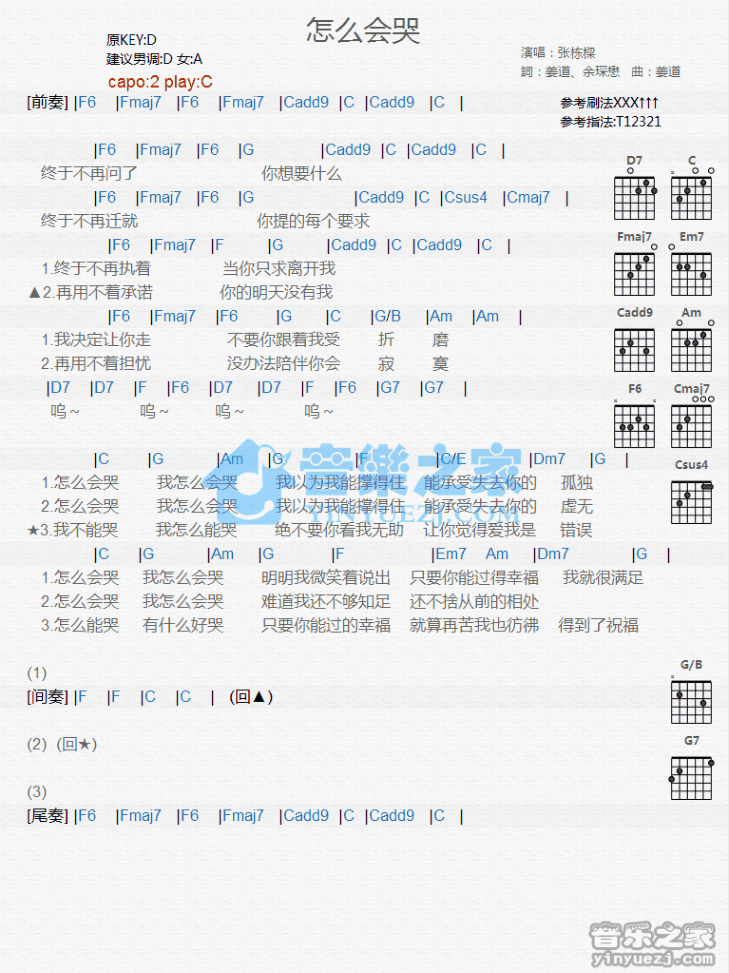 曲谱介绍: C调版张栋梁《怎么会哭》吉他和弦弹唱谱