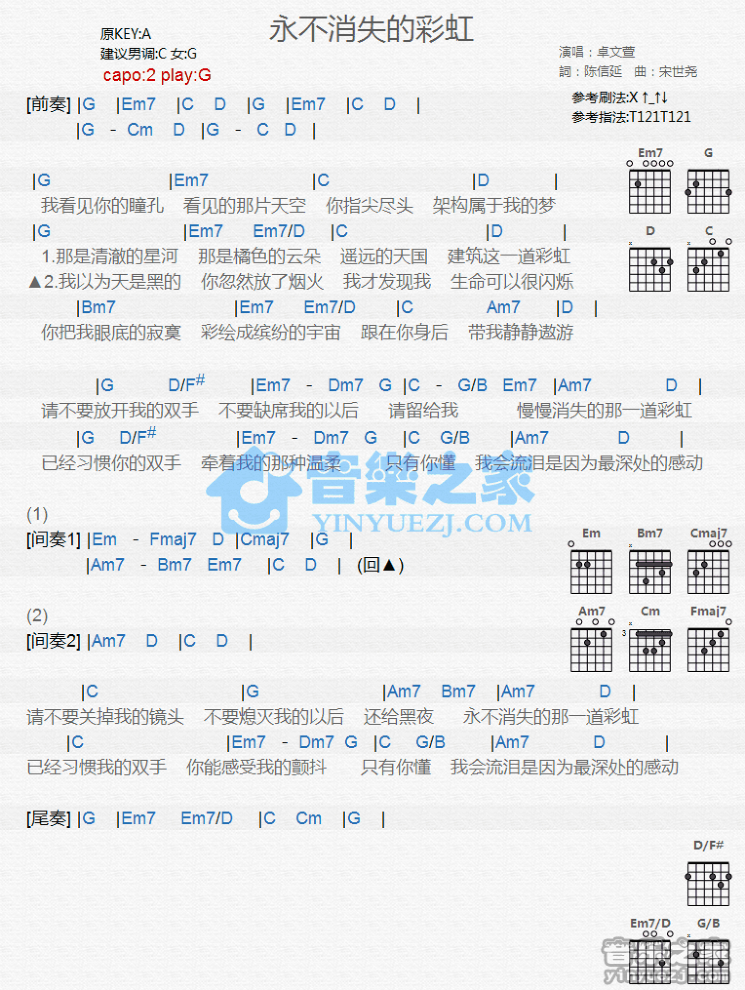 曲谱介绍: G调版卓文萱《永不消失的彩虹》吉他和弦弹唱谱