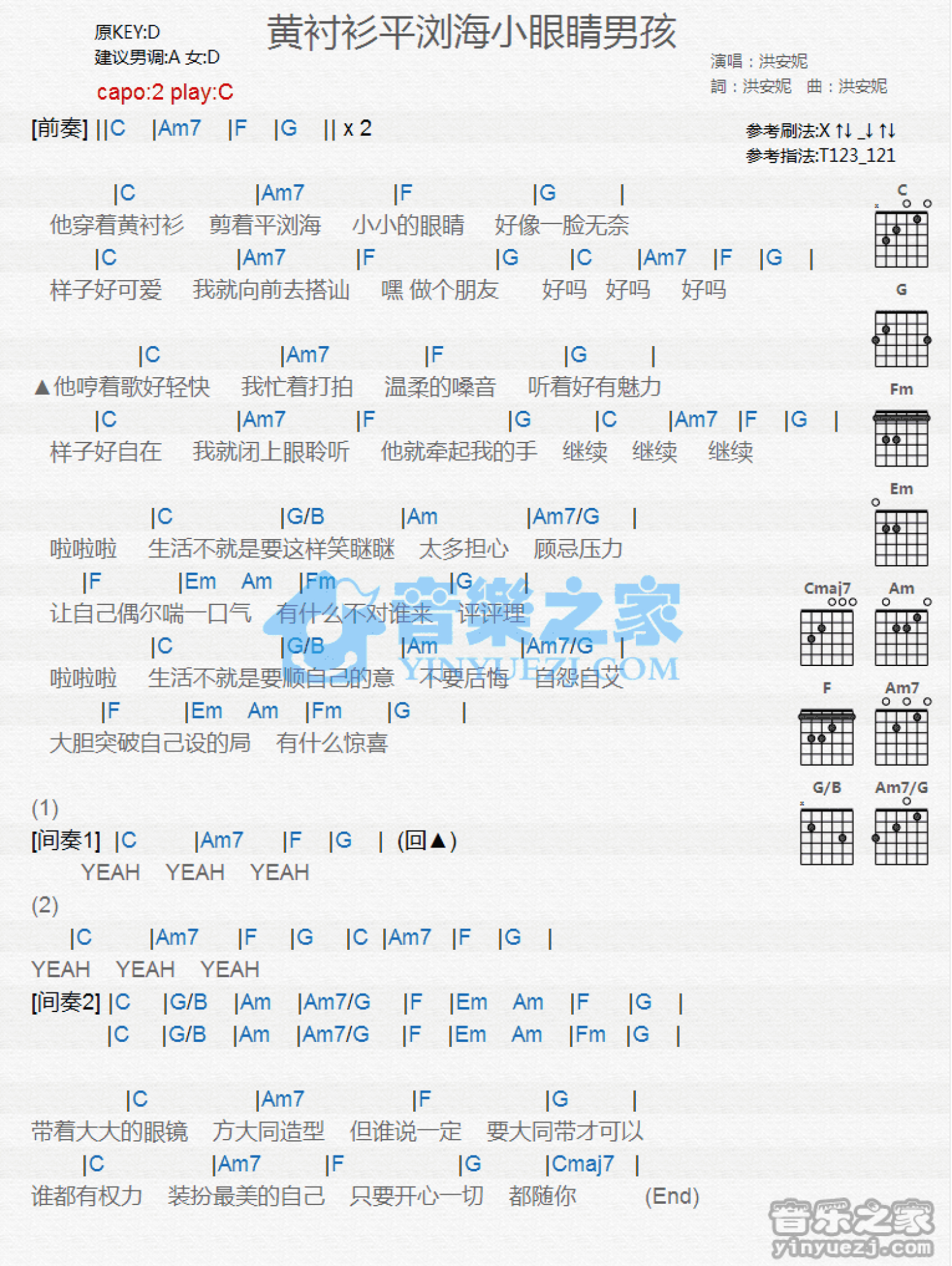 黄衬衫平刘海小眼睛男孩吉他谱 - 洪安妮 - C调吉他弹唱谱 - 和弦谱