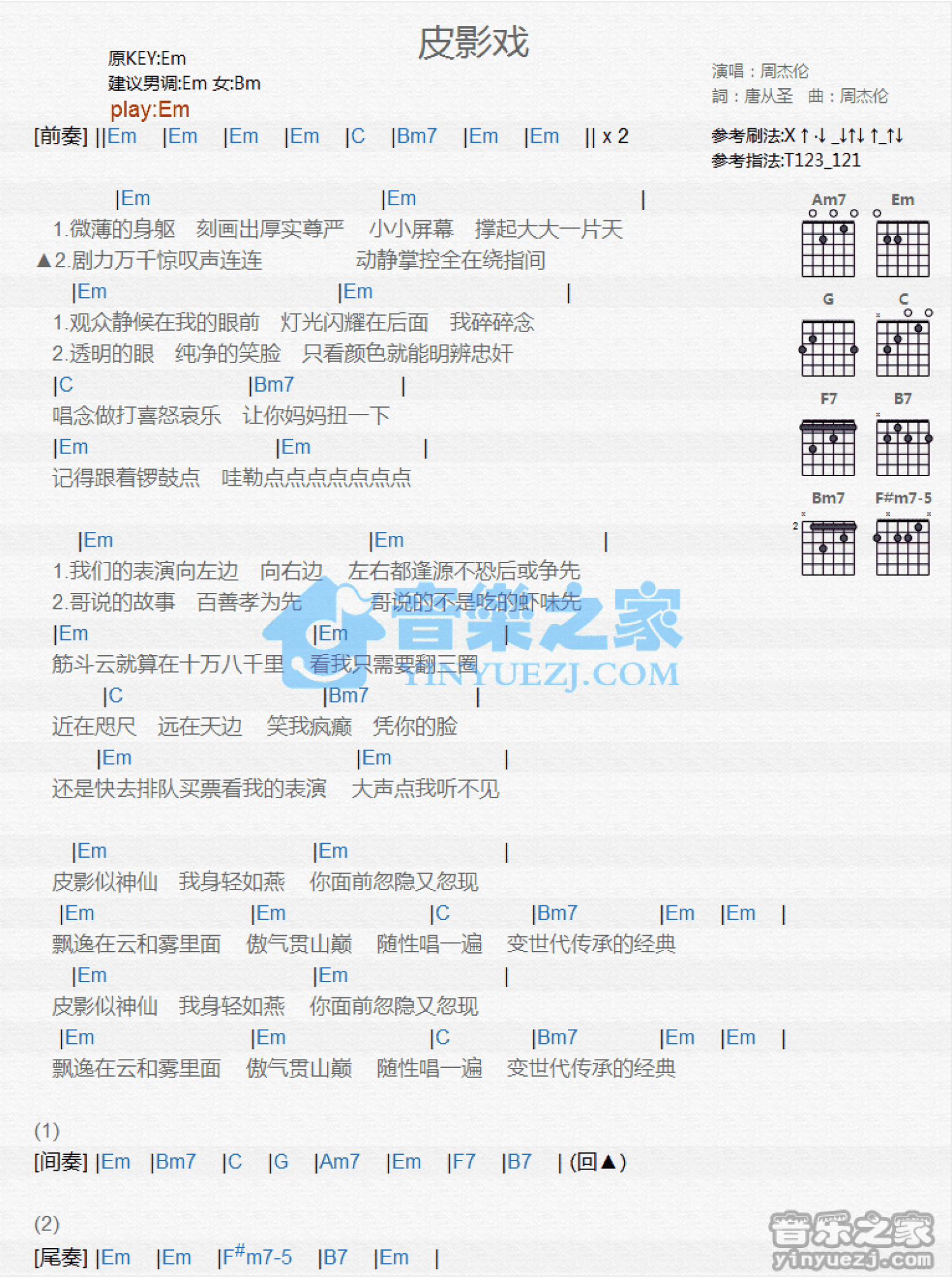 曲谱介绍: Em调版周杰伦《皮影戏》吉他和弦弹唱谱