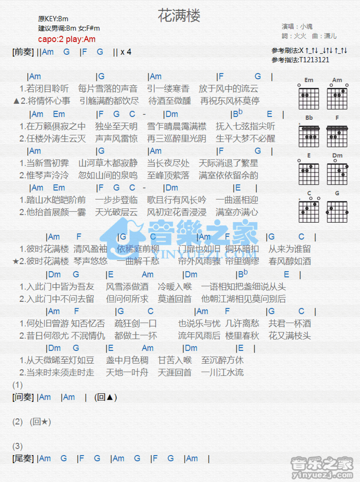 曲谱介绍: Am调版小魂《花满楼》吉他和弦弹唱谱
