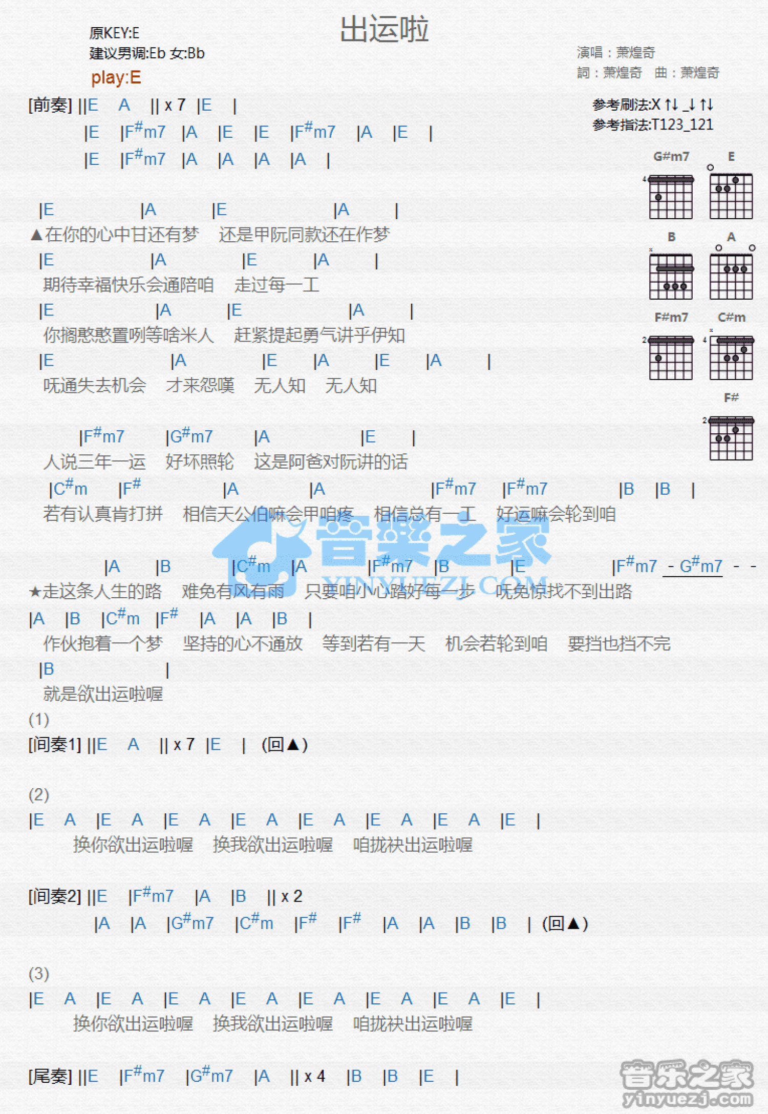 曲谱介绍: E调版萧煌奇《出运啦》吉他和弦弹唱谱