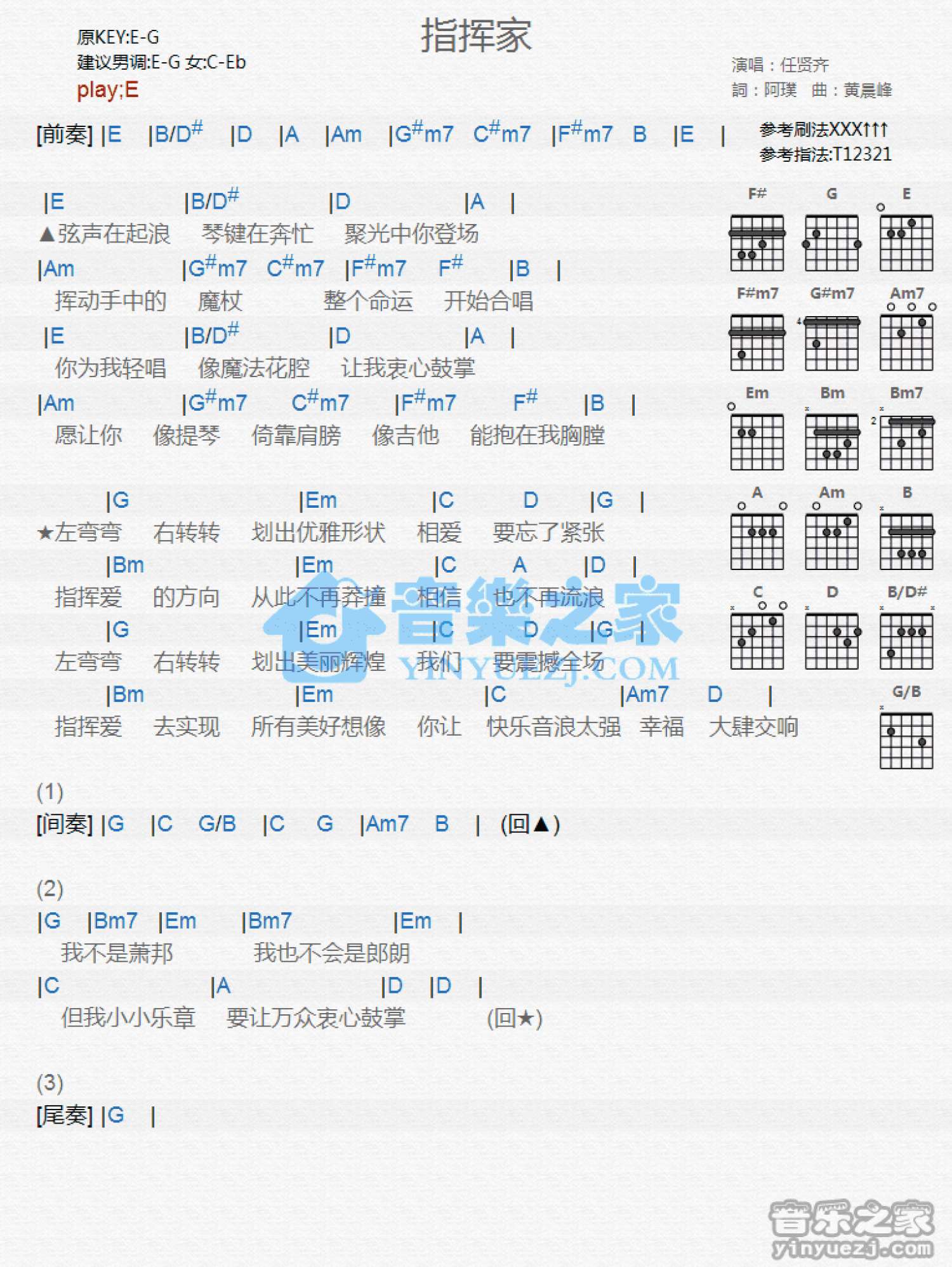 曲谱介绍: E调版任贤齐《指挥家》吉他和弦弹唱谱