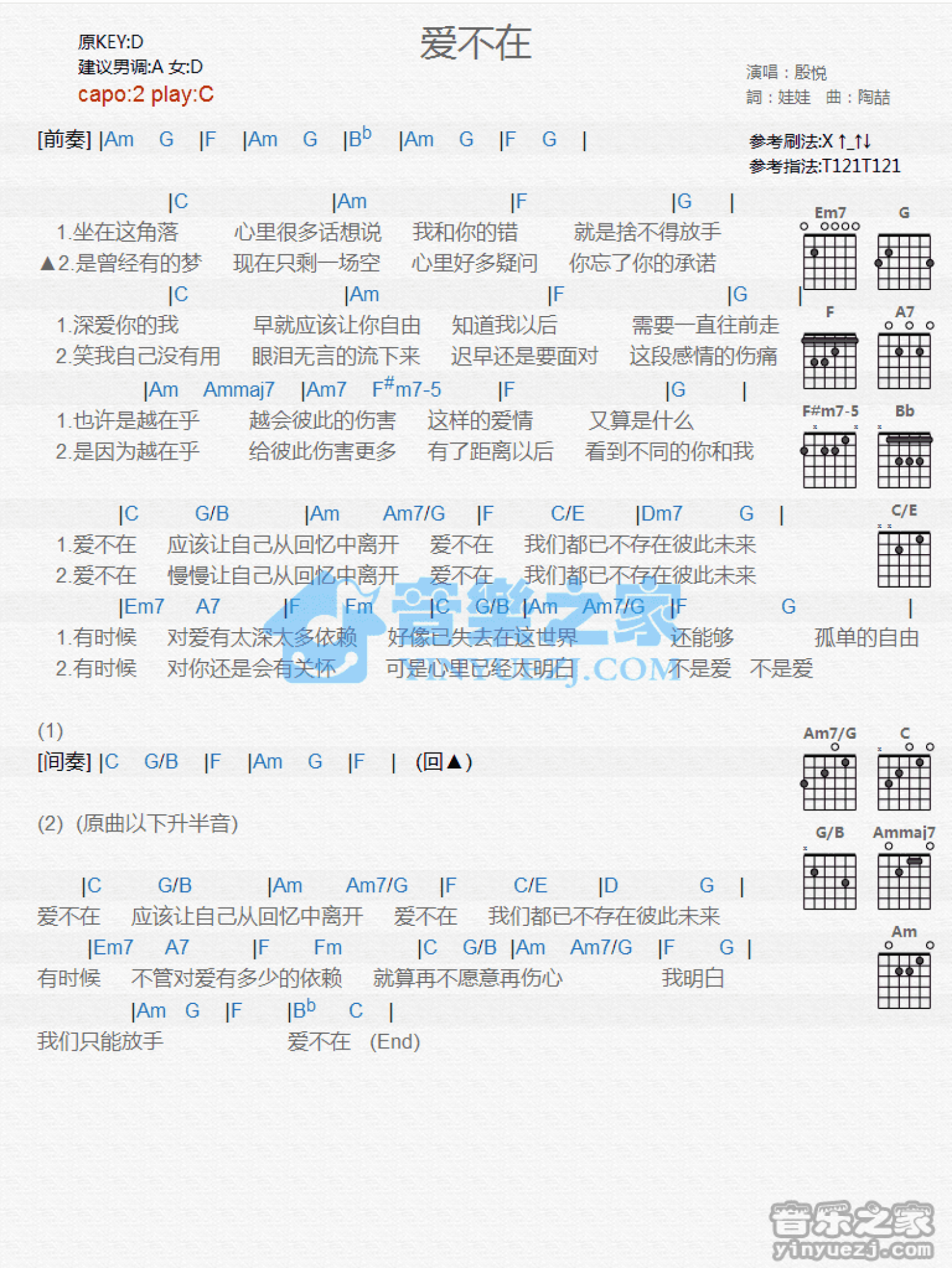 爱不在吉他谱 - 殷悦 - C调吉他弹唱谱 - 和弦谱
