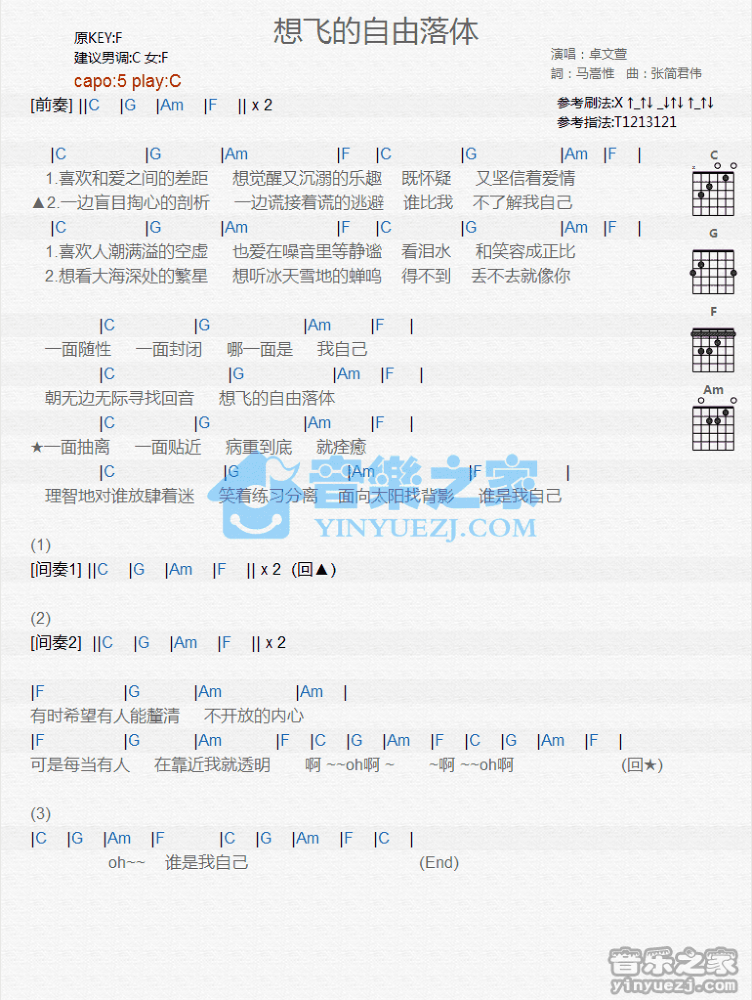 曲谱介绍: C调版卓文萱《想飞的自由落体》吉他和弦弹唱谱