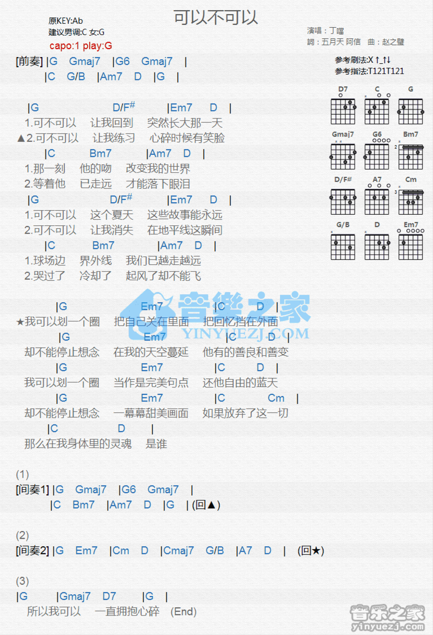 曲谱介绍: G调版丁当《可以不可以》吉他和弦弹唱谱