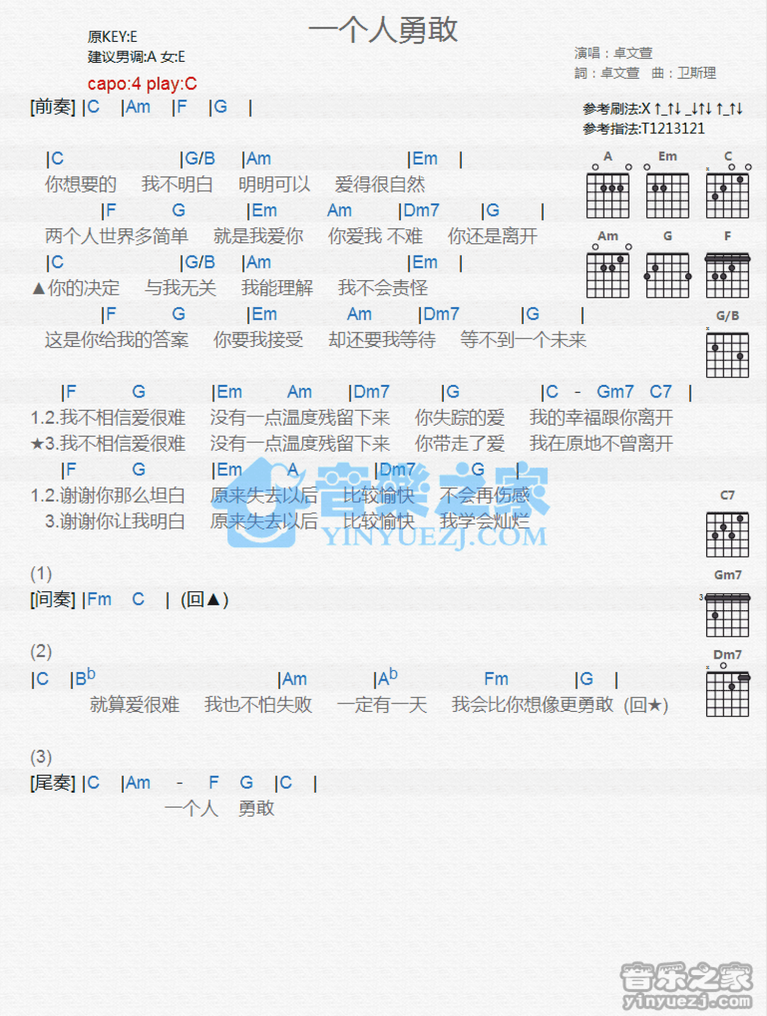 曲谱介绍: C调版卓文萱《一个人勇敢》吉他和弦弹唱谱
