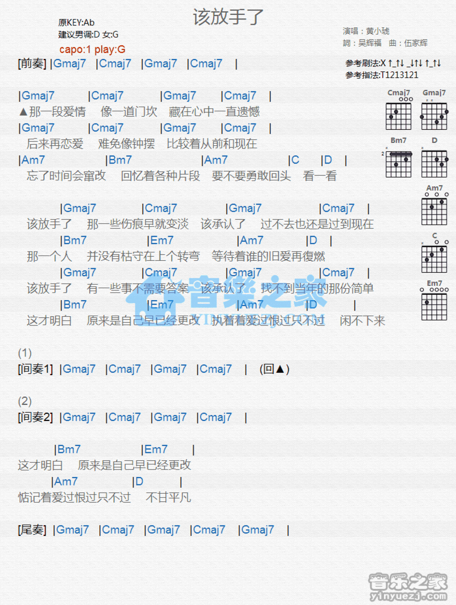曲谱介绍: G调版黄小琥《该放手了》吉他和弦弹唱谱