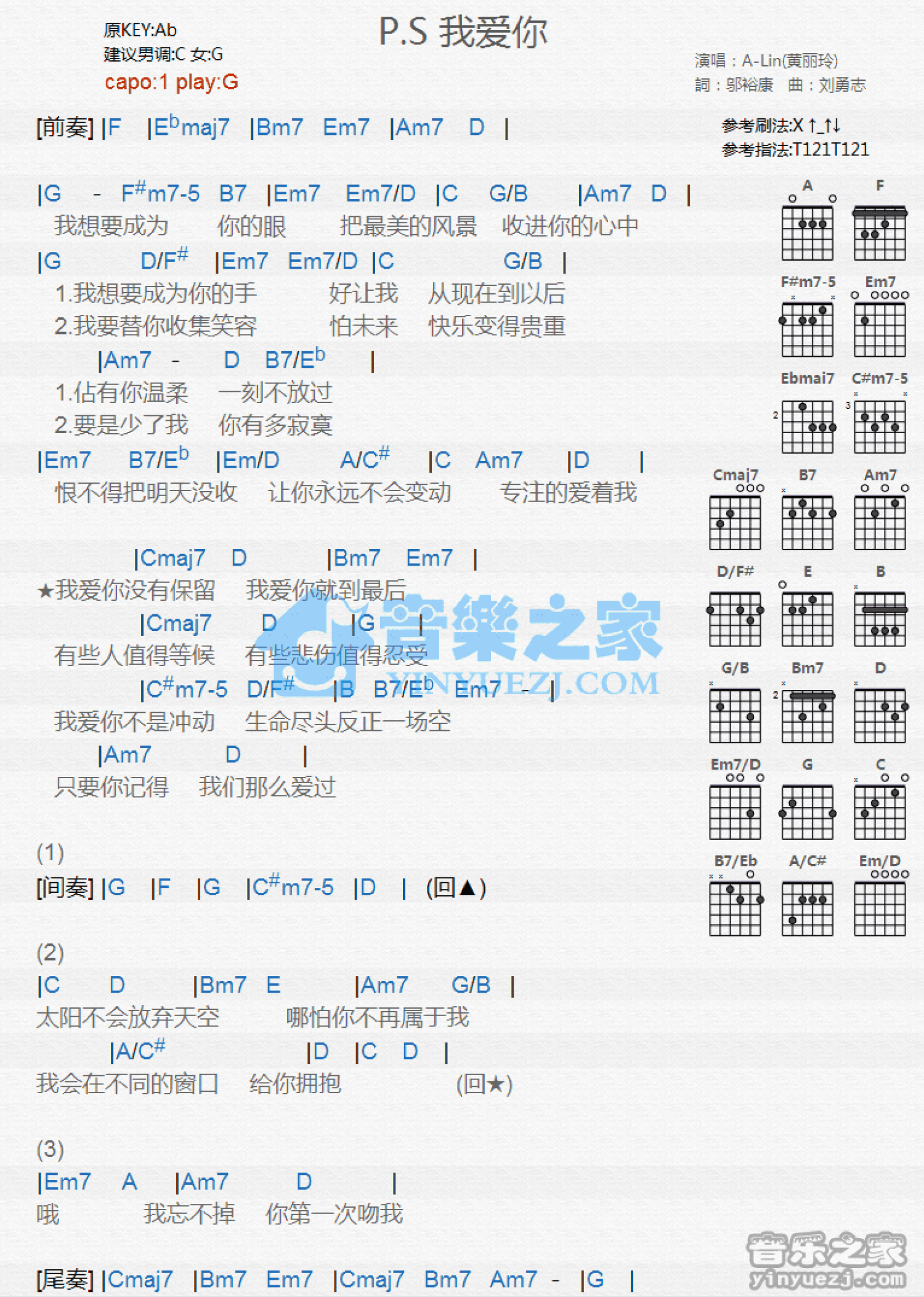 曲谱介绍: G调版A-Lin《P.S.我爱你》吉他和弦弹唱谱