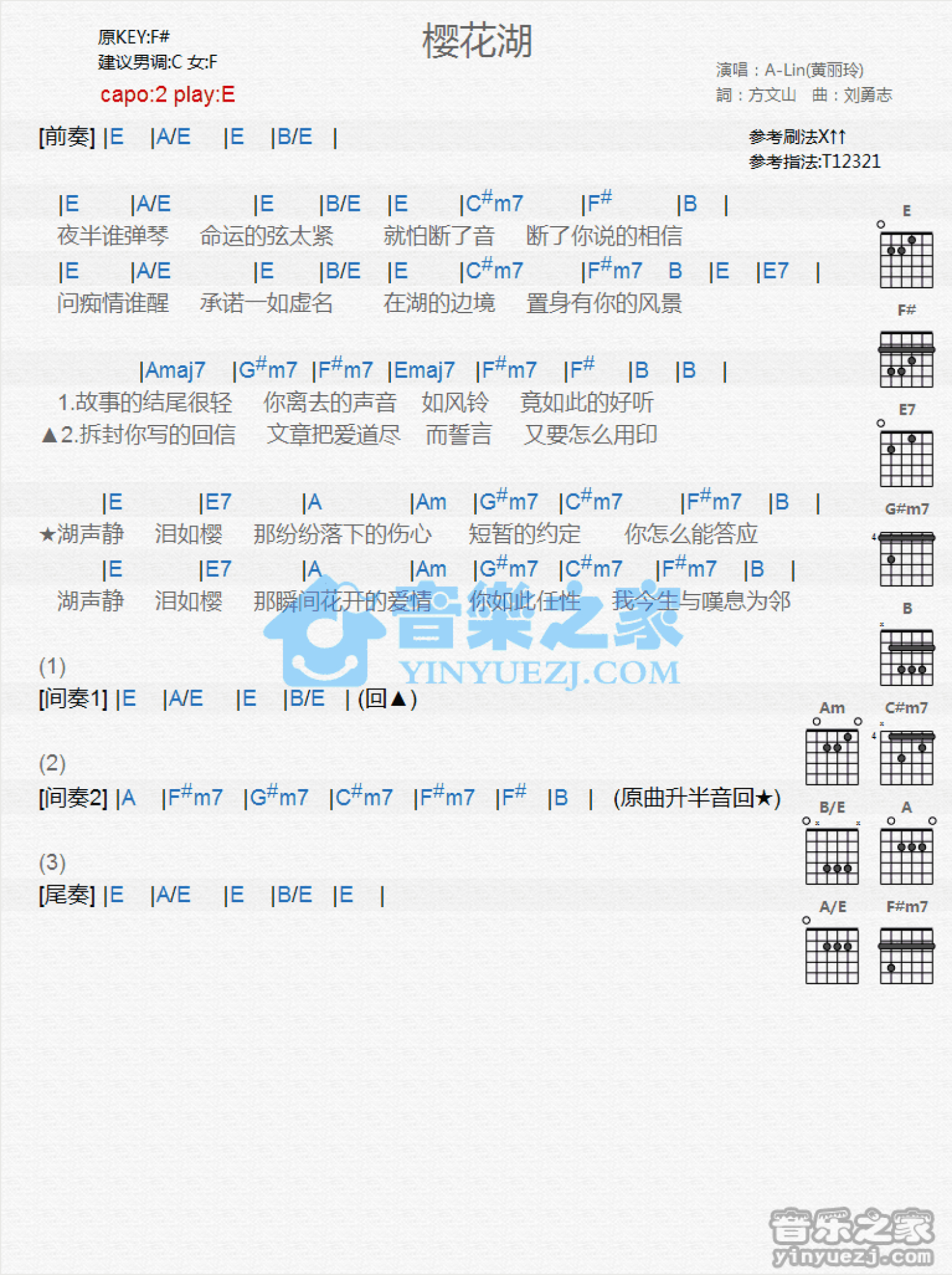 曲谱介绍: E调版A-Lin《樱花湖》吉他和弦弹唱谱
