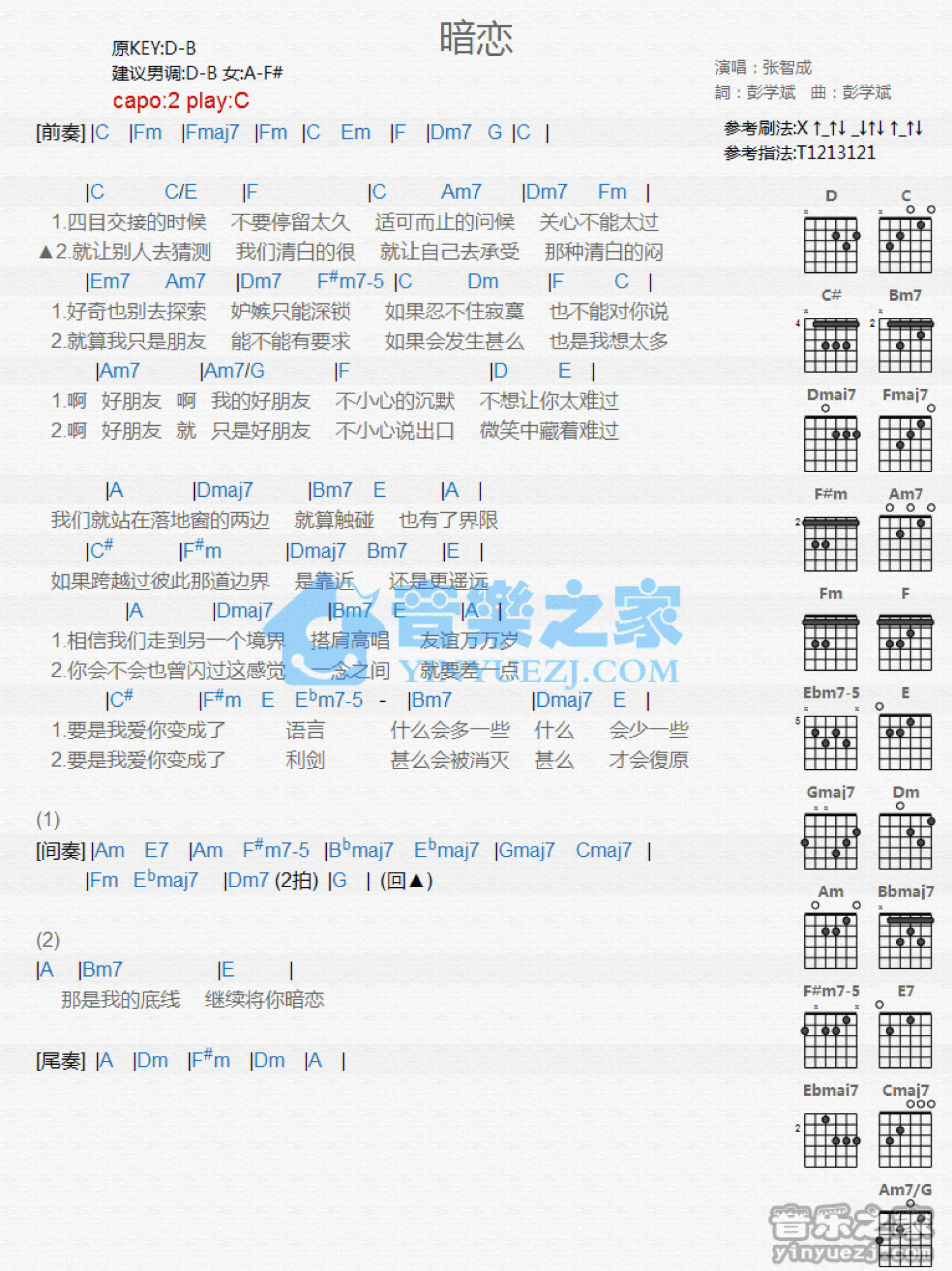 曲谱介绍: C调版张智成《暗恋》吉他和弦弹唱谱