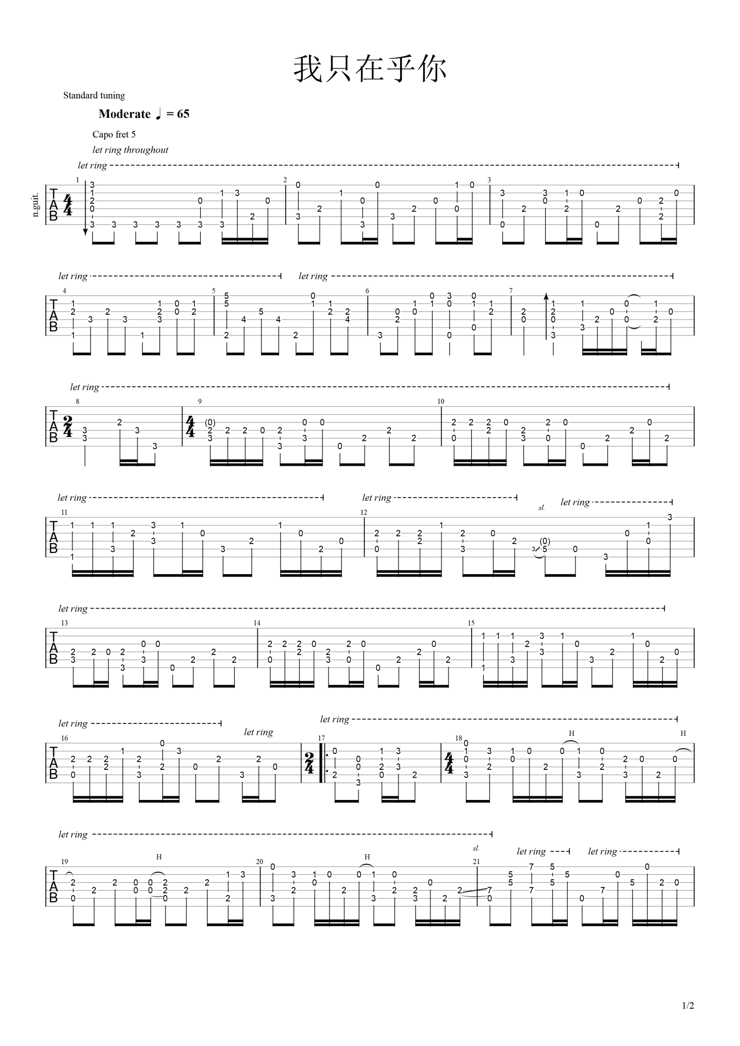 • 我只在乎你吉他谱 - 邓丽君 - 吉他独奏谱 - 冈崎伦典改编版第1张
