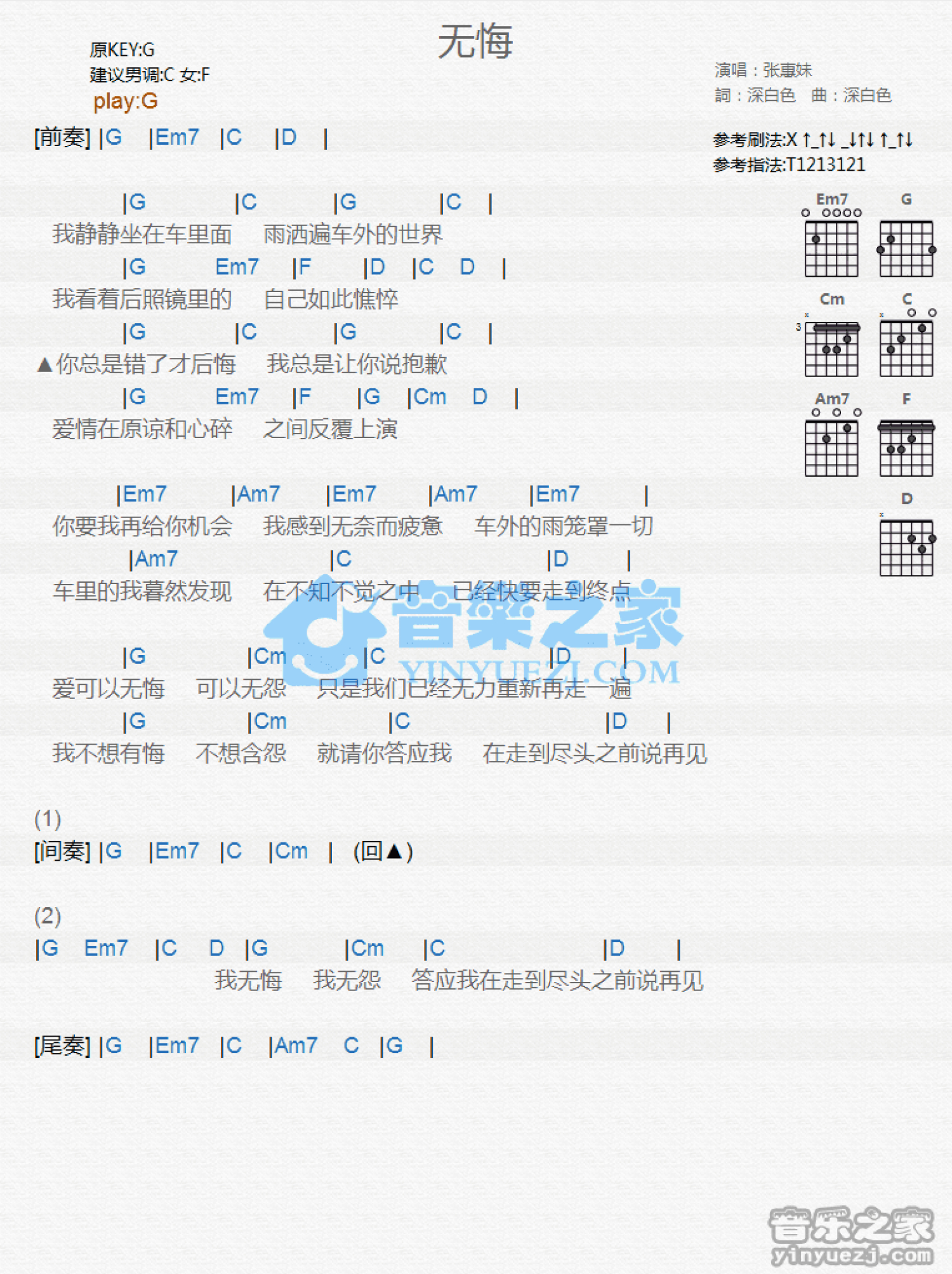 无悔吉他谱 - 张惠妹 - G调吉他弹唱谱 - 和弦谱