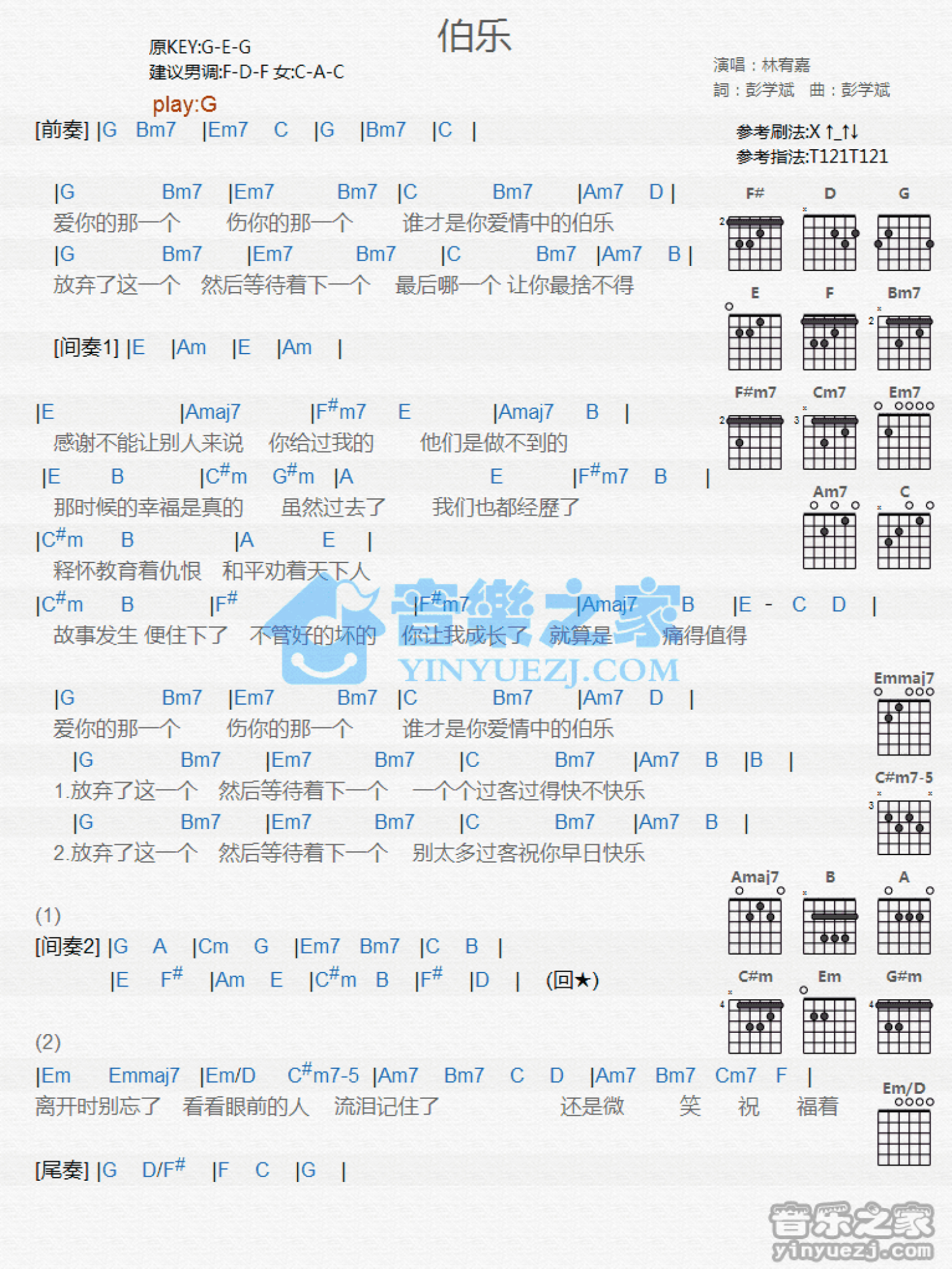 曲谱介绍: G调版林宥嘉《伯乐》吉他和弦弹唱谱