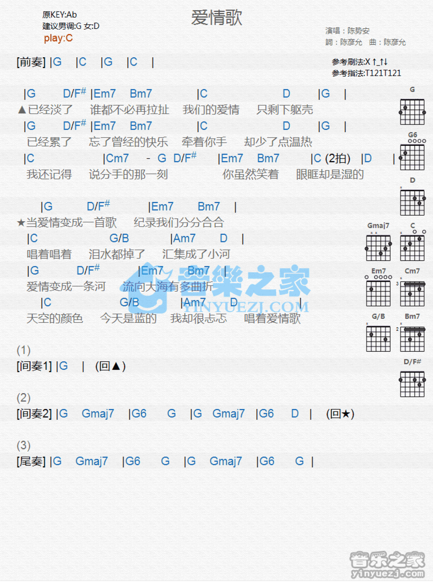 爱情歌吉他谱 - 陈势安 - C调吉他弹唱谱 - 和弦谱