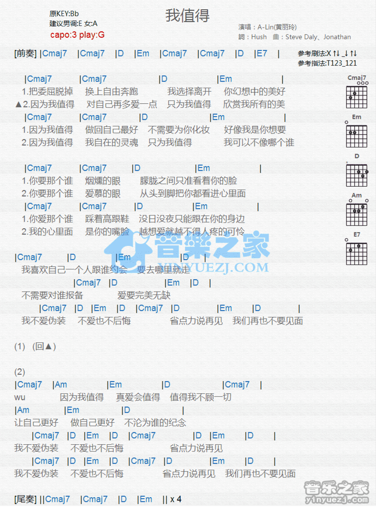 曲谱介绍: G调版《我值得》吉他和弦弹唱谱