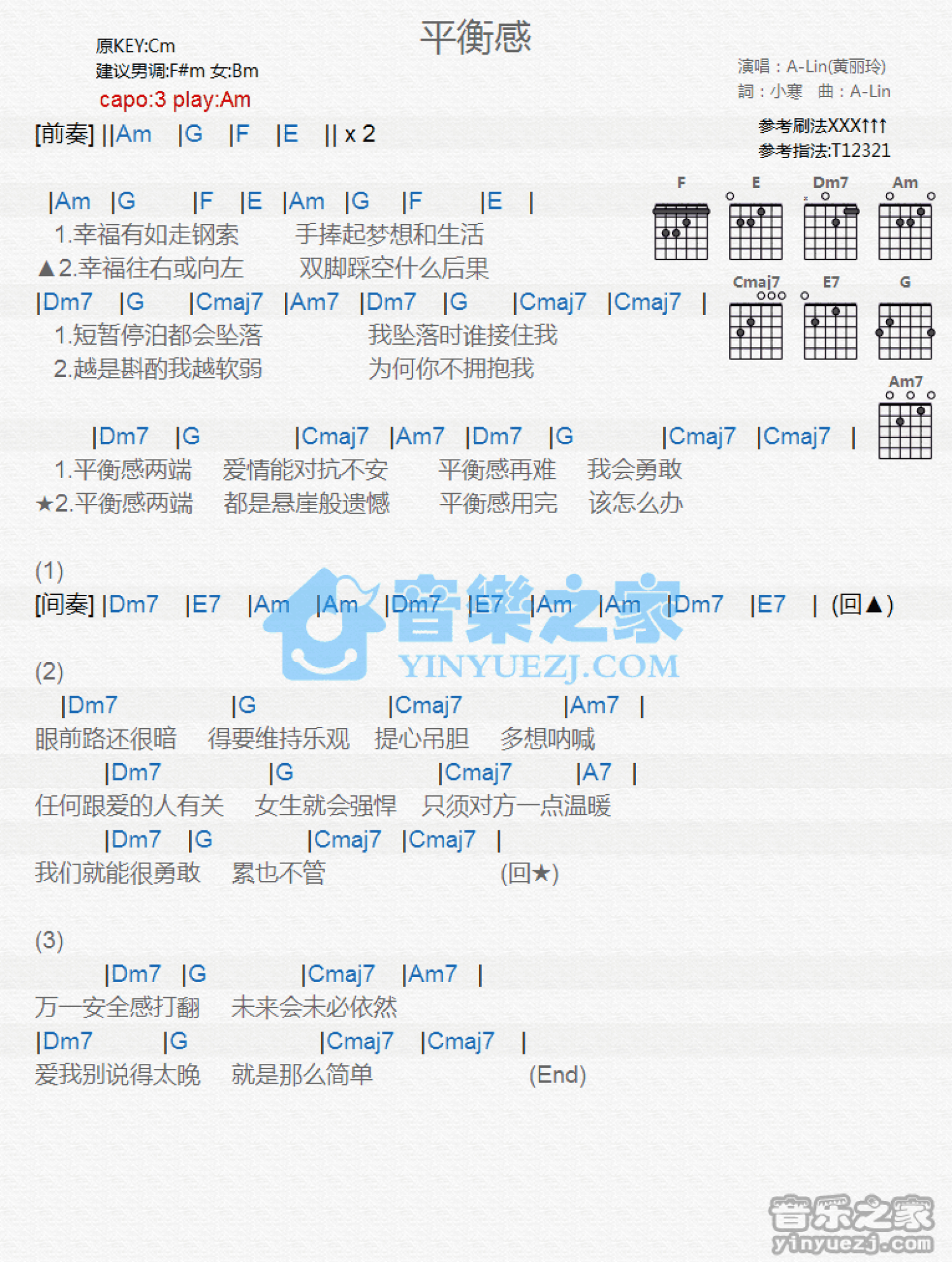 曲谱介绍: Am调版A-Lin《平衡感》吉他和弦弹唱谱