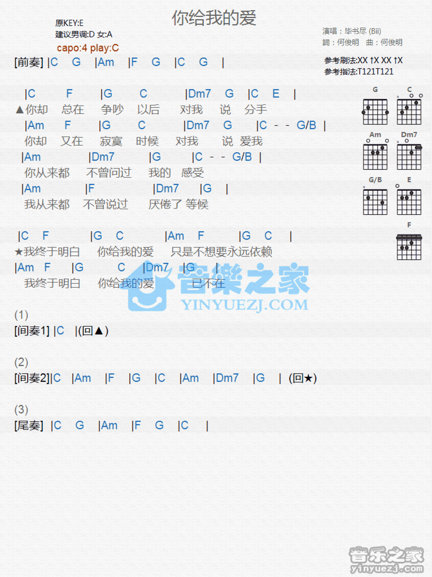 曲谱介绍: C调版《你给我的爱》吉他和弦弹唱谱