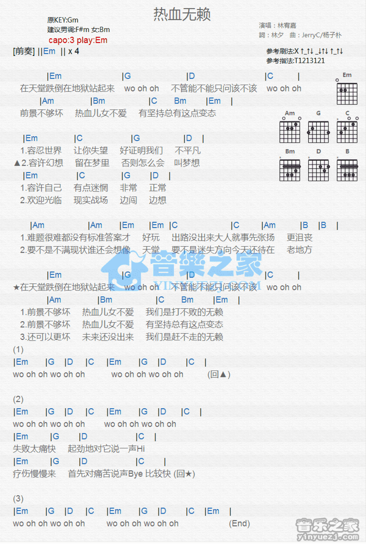 曲谱介绍: Em调版林宥嘉《热血无赖》吉他和弦弹唱谱