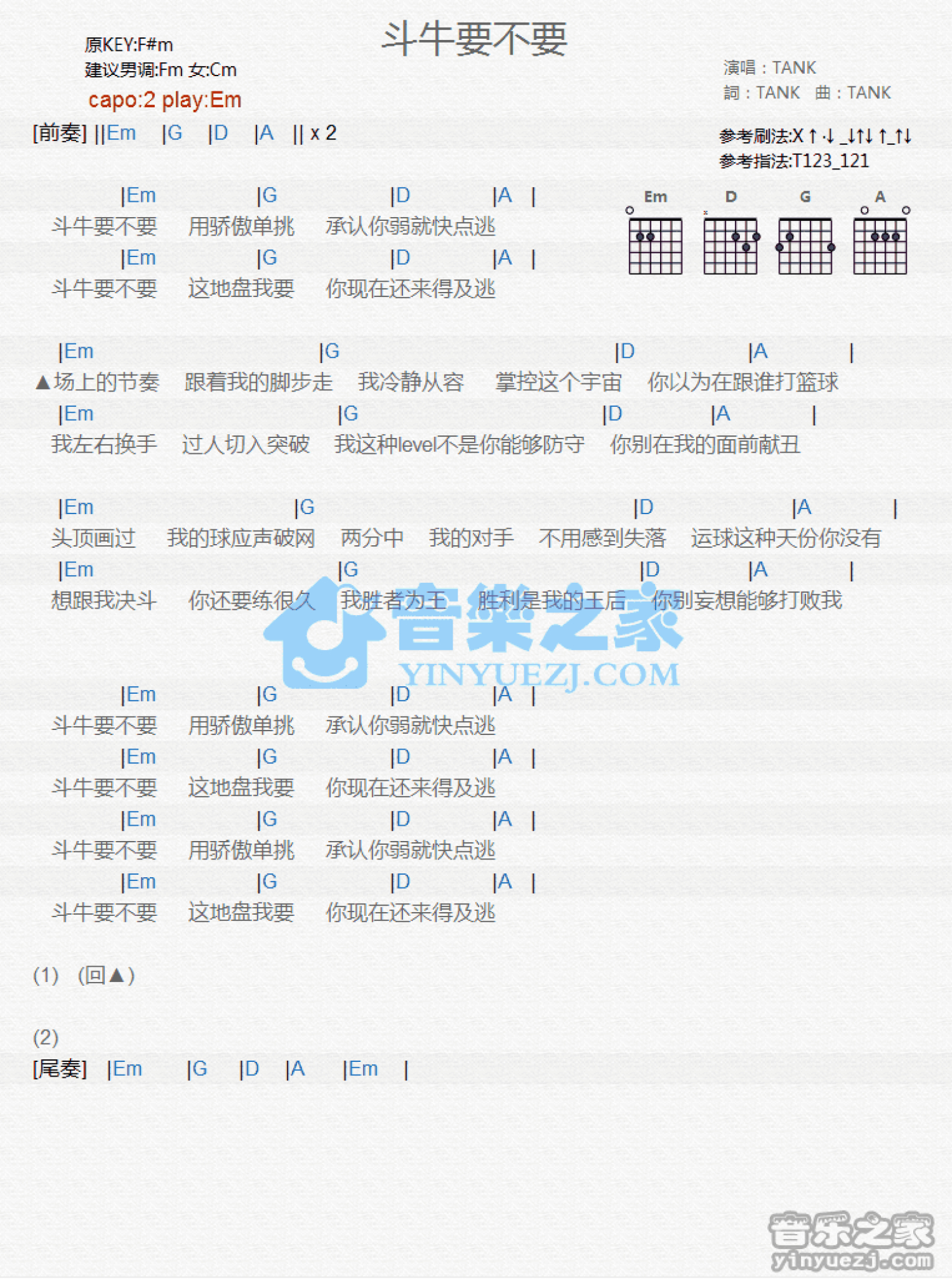 曲谱介绍: Em调版 TANK《斗牛要不要》吉他和弦弹唱谱