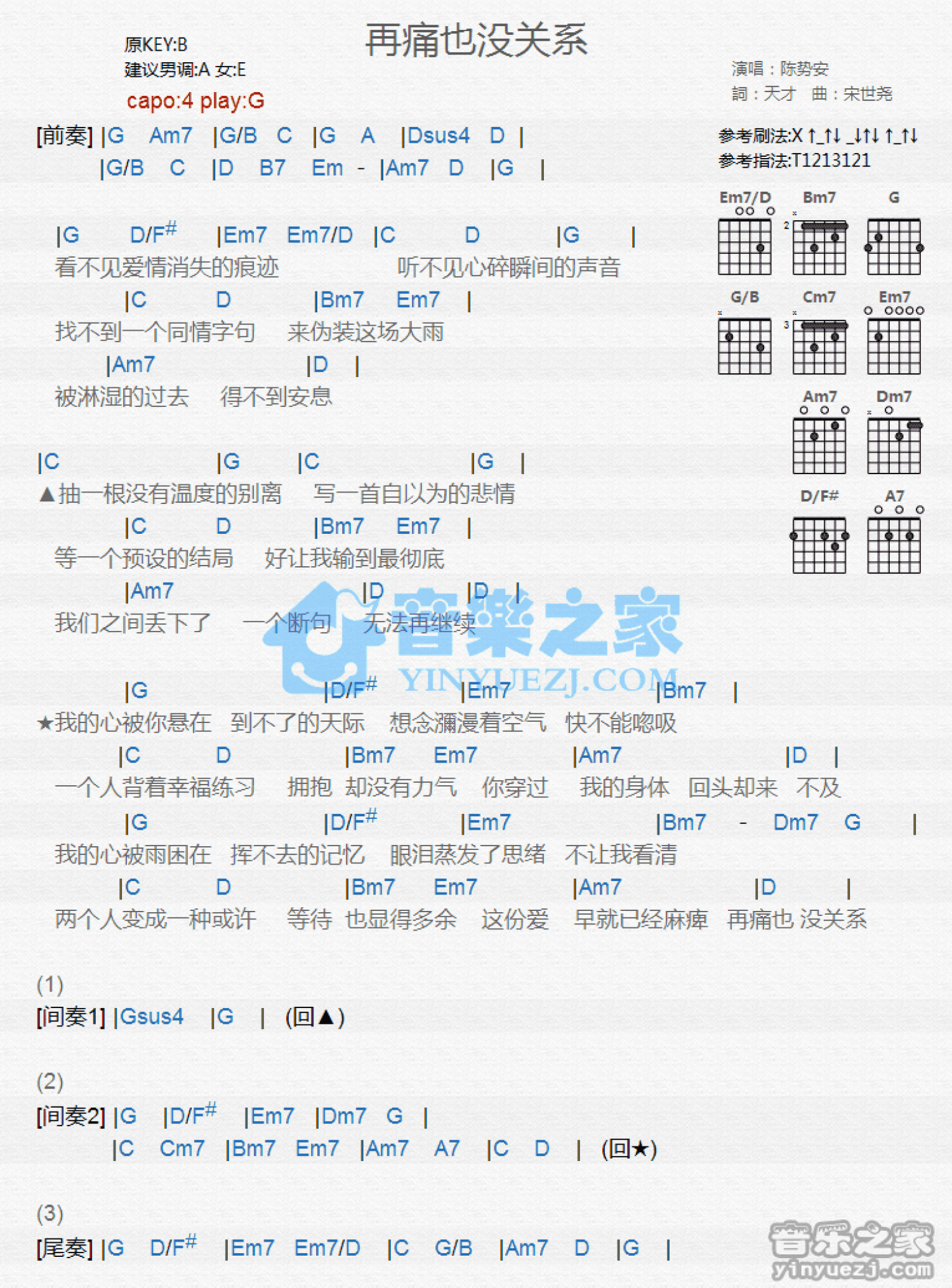 曲谱介绍: G调版陈势安《再痛也没关系》吉他和弦弹唱谱