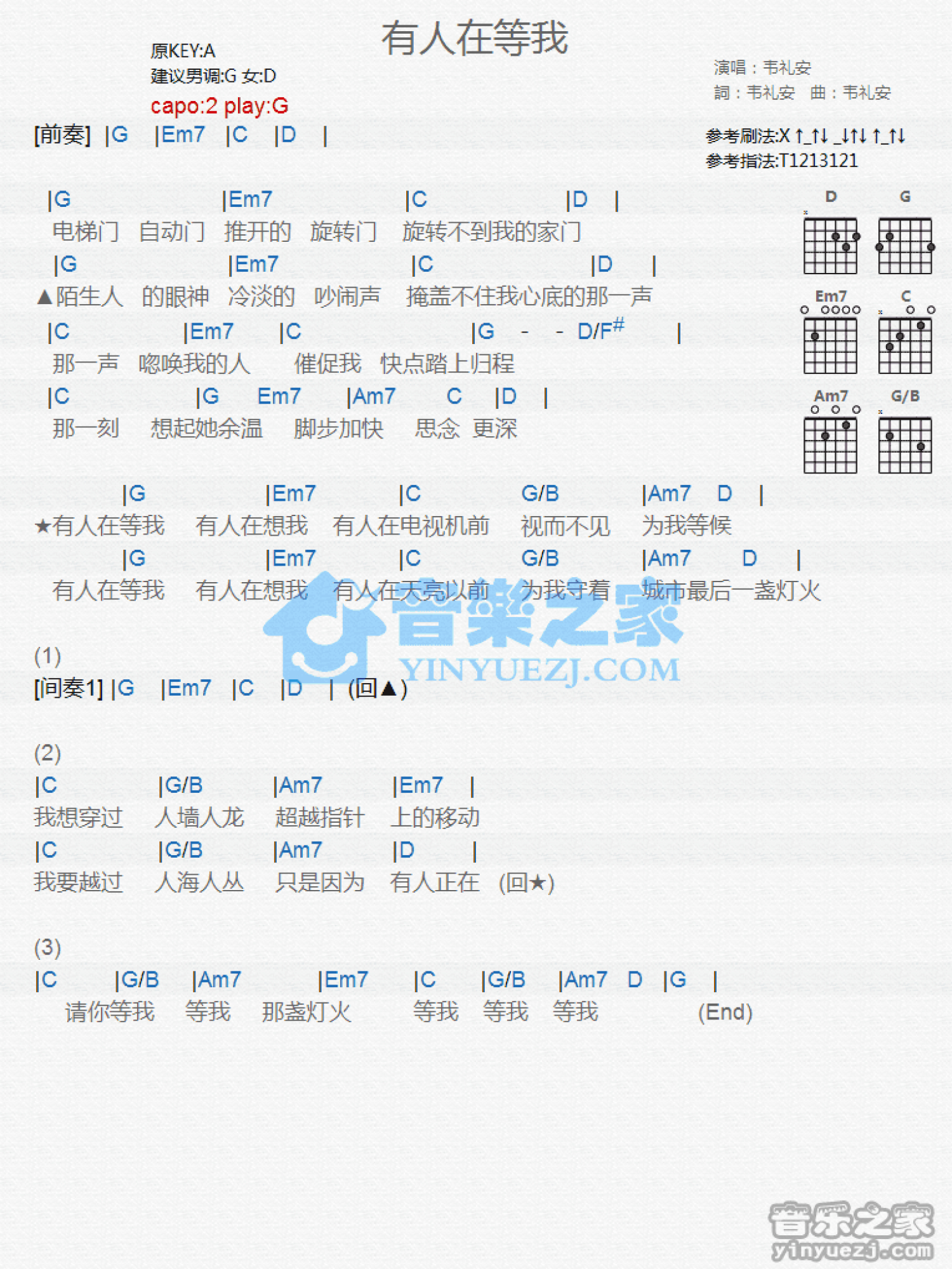 曲谱介绍: G调版韦礼安《有人在等我》吉他和弦弹唱谱