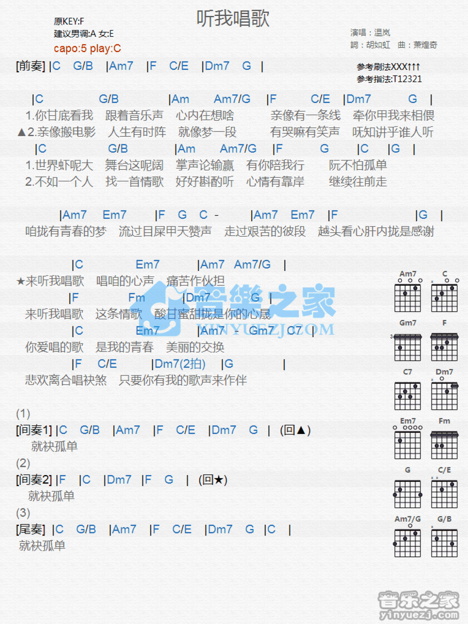 曲谱介绍: C调版温岚《听我唱歌》吉他和弦弹唱谱