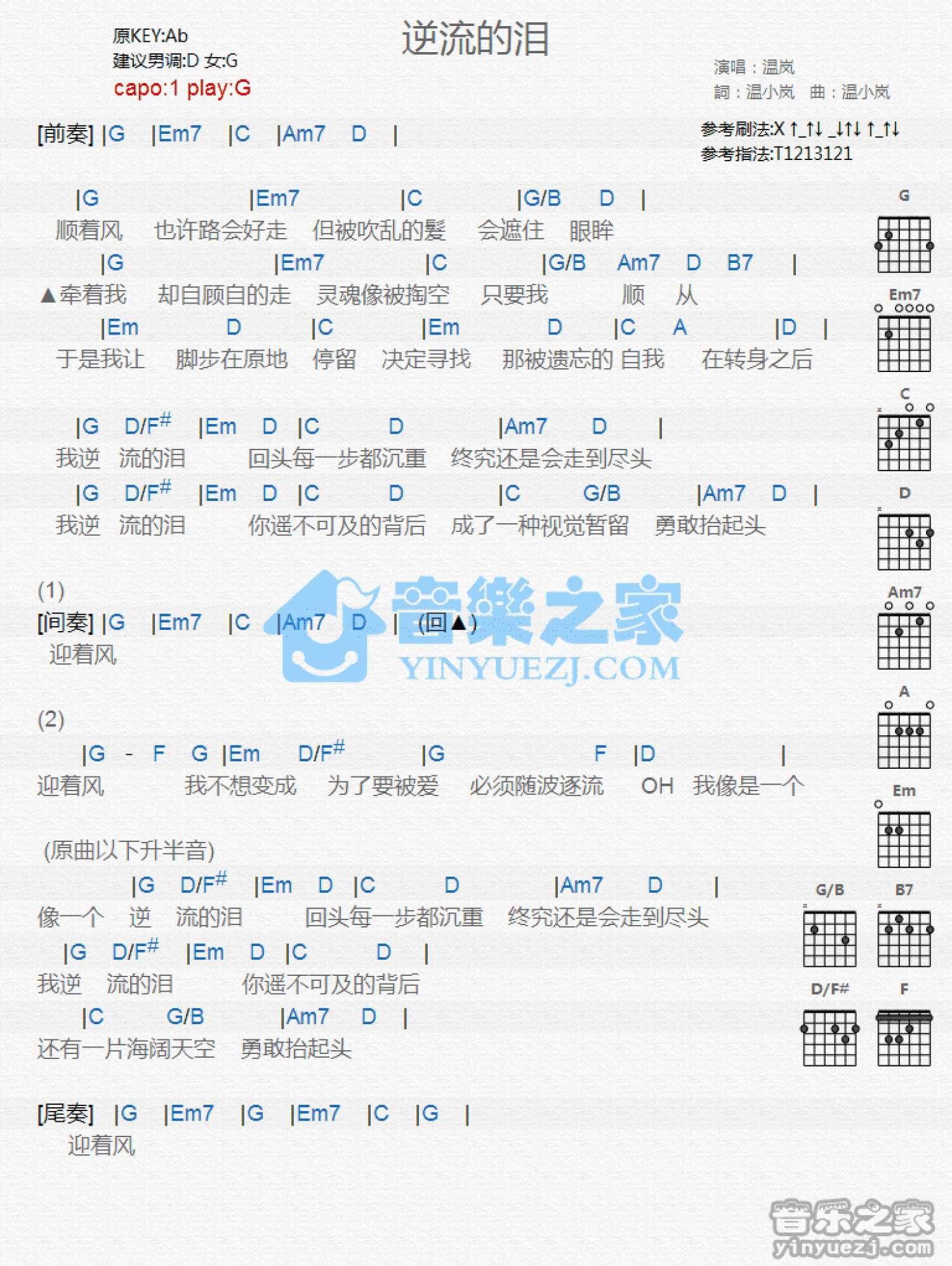 曲谱介绍: G调版温岚《逆流的泪》吉他和弦弹唱谱