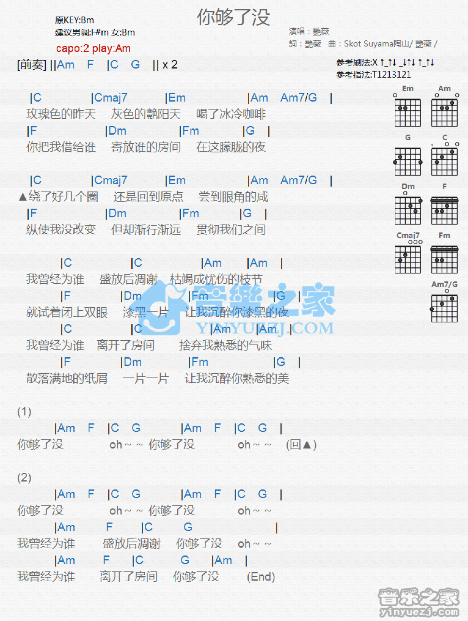 曲谱介绍: Am调版艳薇《你够了没》吉他和弦弹唱谱
