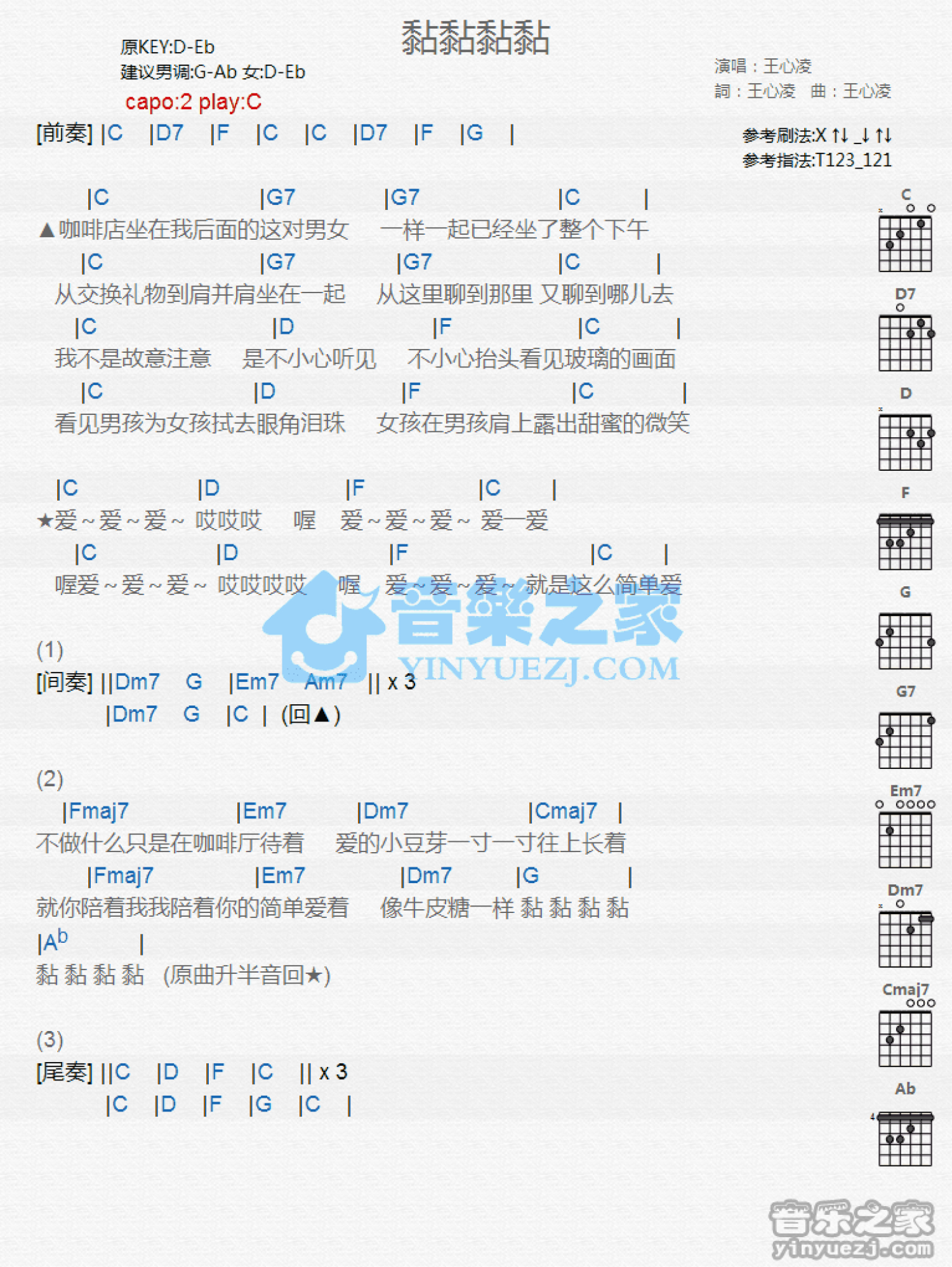 曲谱介绍: C调版王心凌《黏黏黏黏》吉他和弦弹唱谱