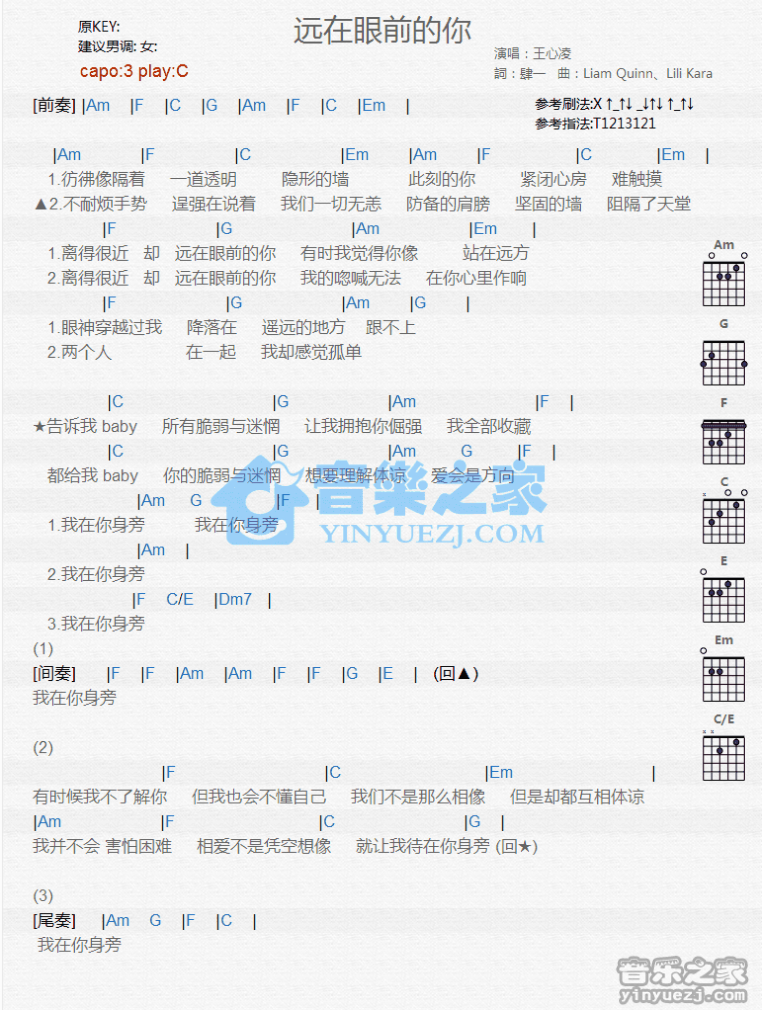 曲谱介绍: C调版王心凌《远在眼前的你》吉他和弦弹唱谱