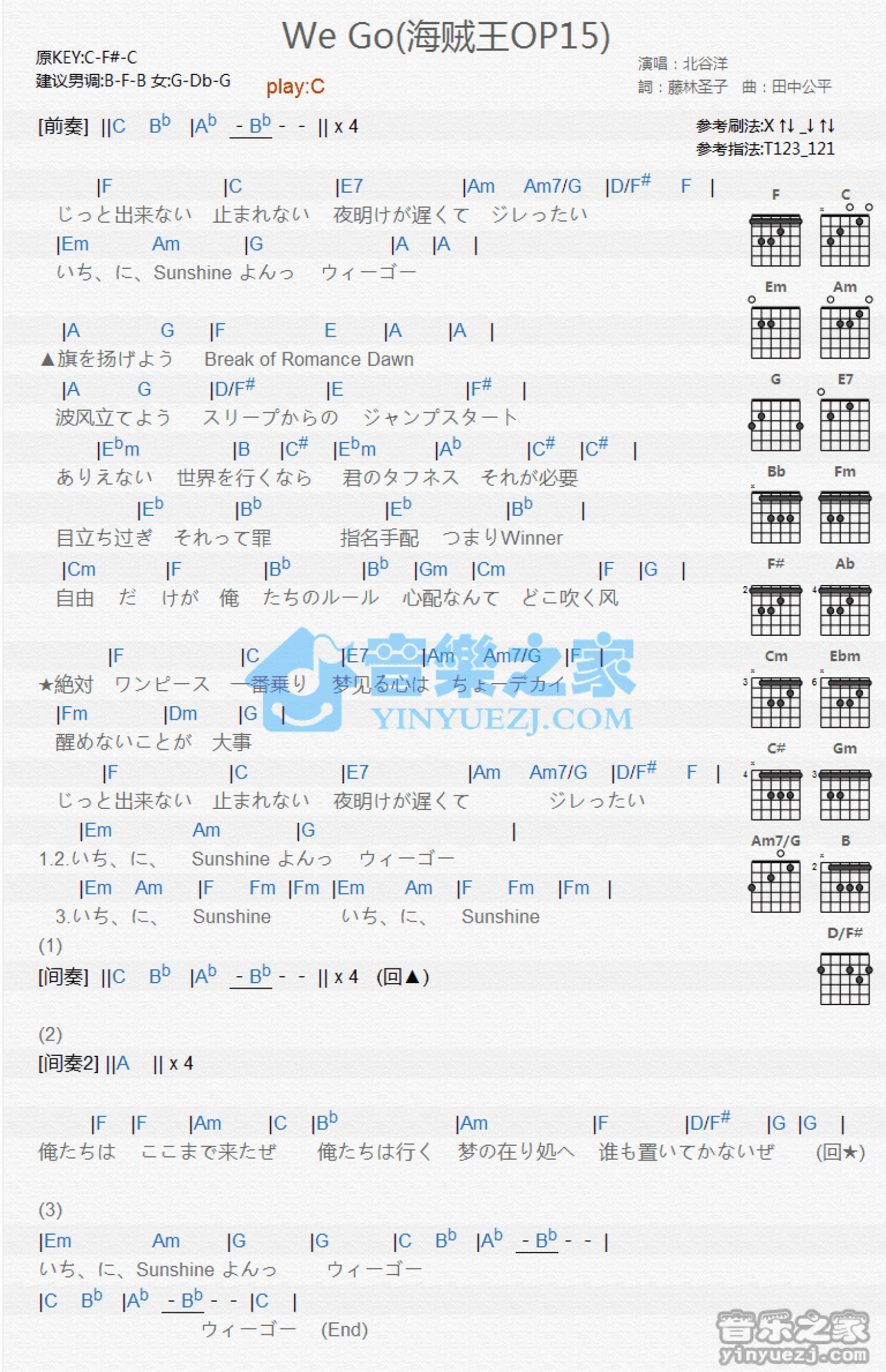 曲谱介绍: C调版北谷洋《WeGo》吉他和弦弹唱谱