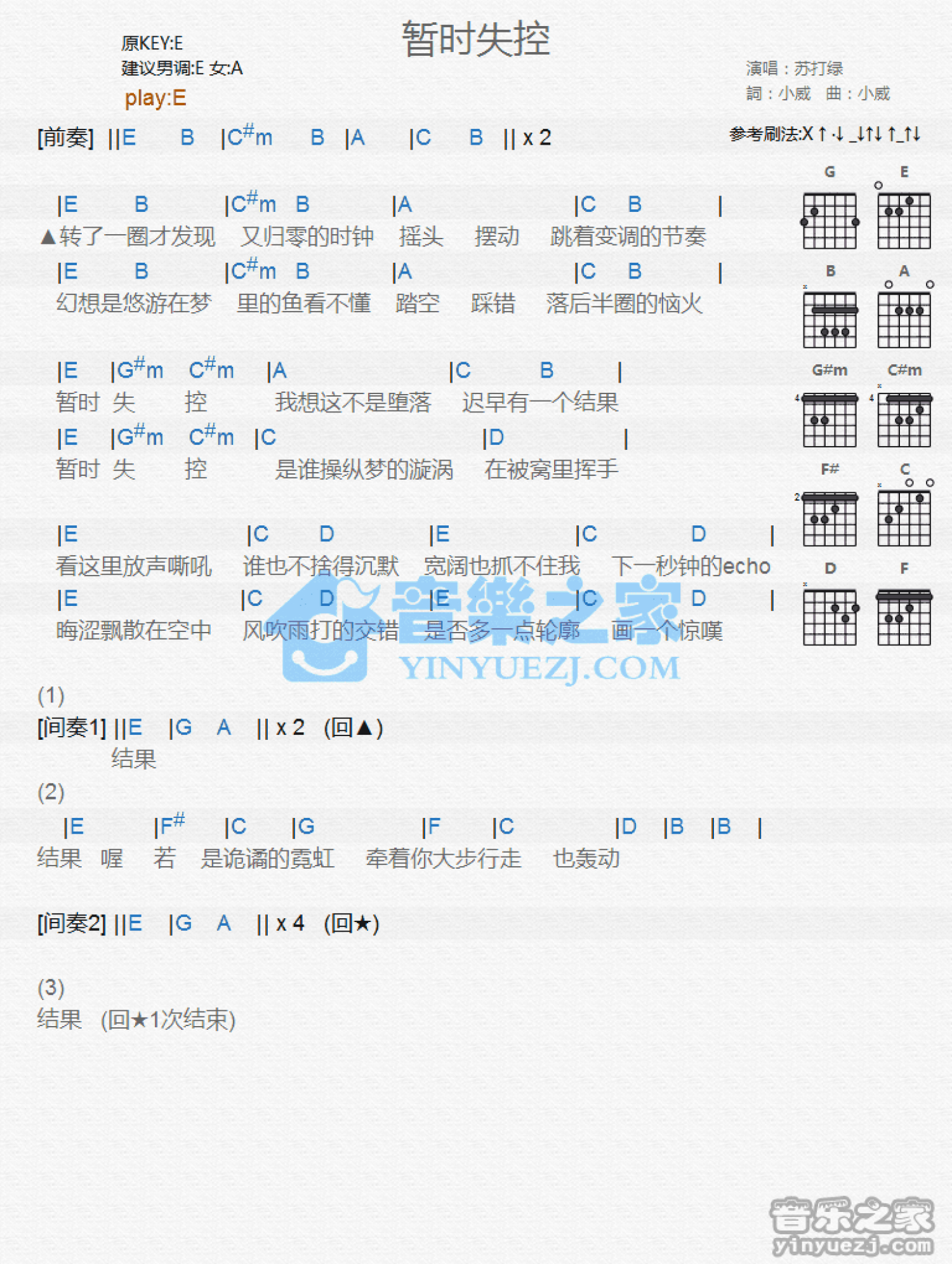 曲谱介绍: E调版 苏打绿《暂时失控》吉他和弦弹唱谱
