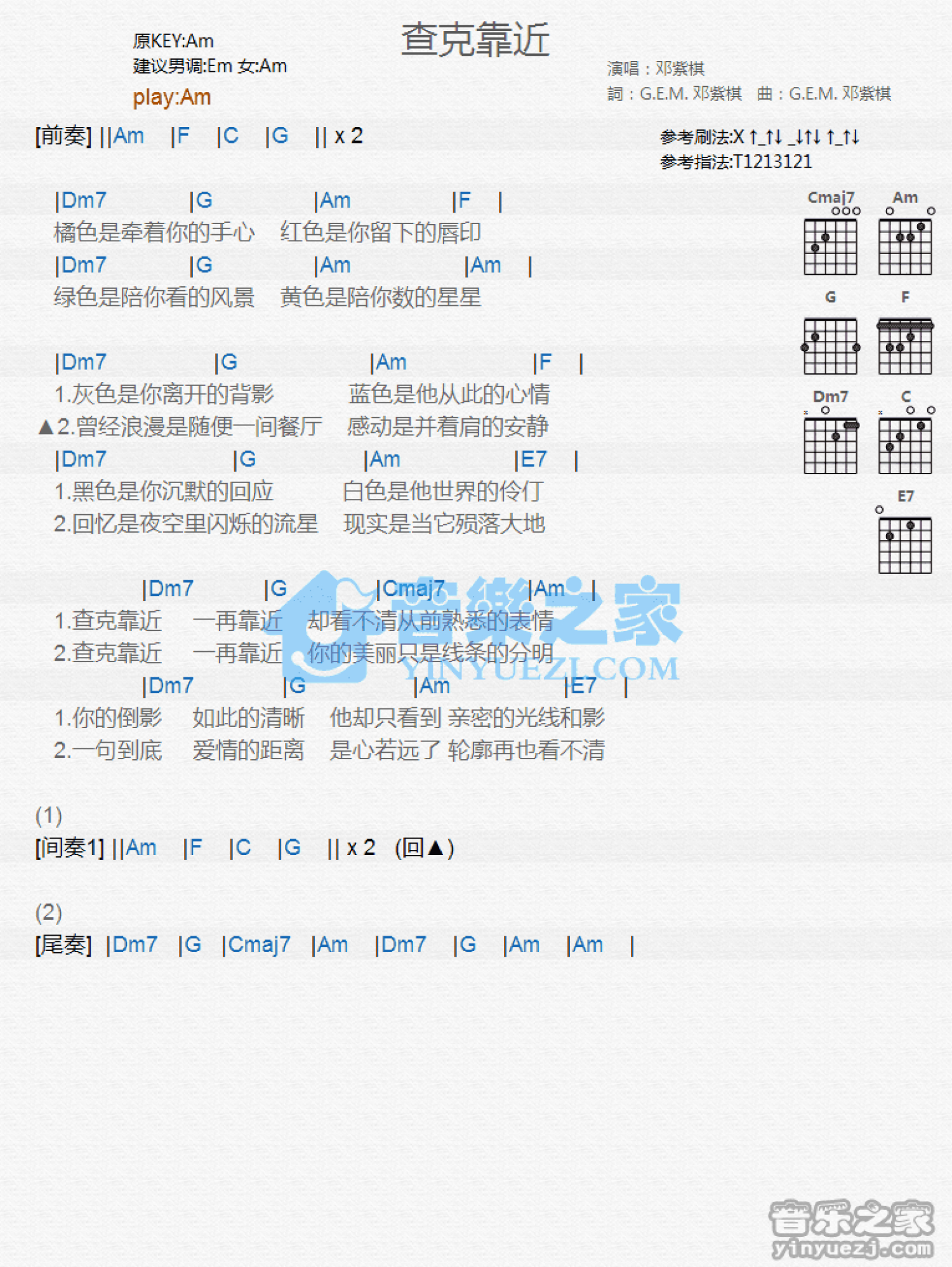 曲谱介绍: Am调版邓紫棋《查克靠近》吉他和弦弹唱谱