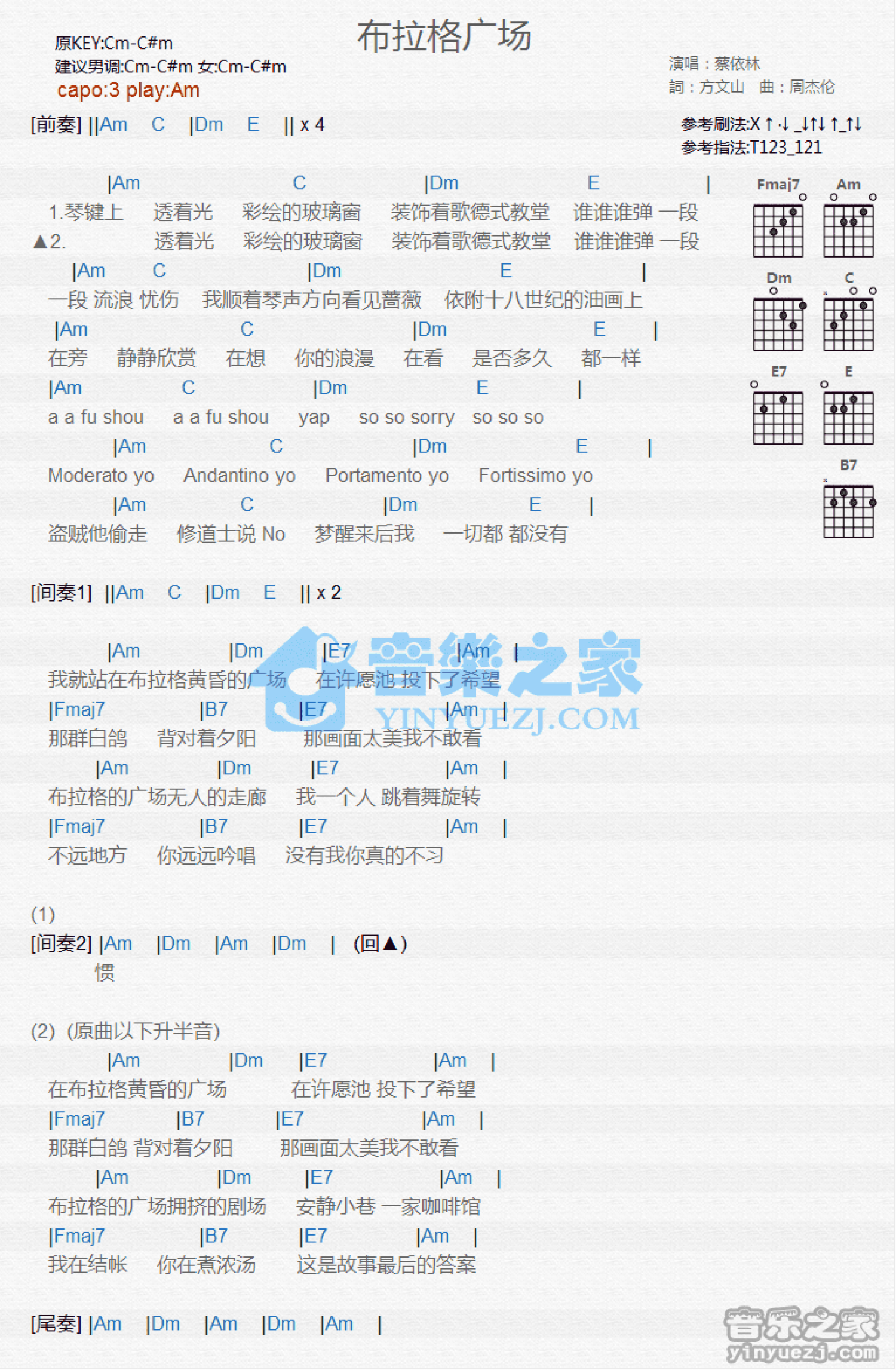 曲谱介绍: Am调版蔡依林《布格拉广场》吉他和弦弹唱谱