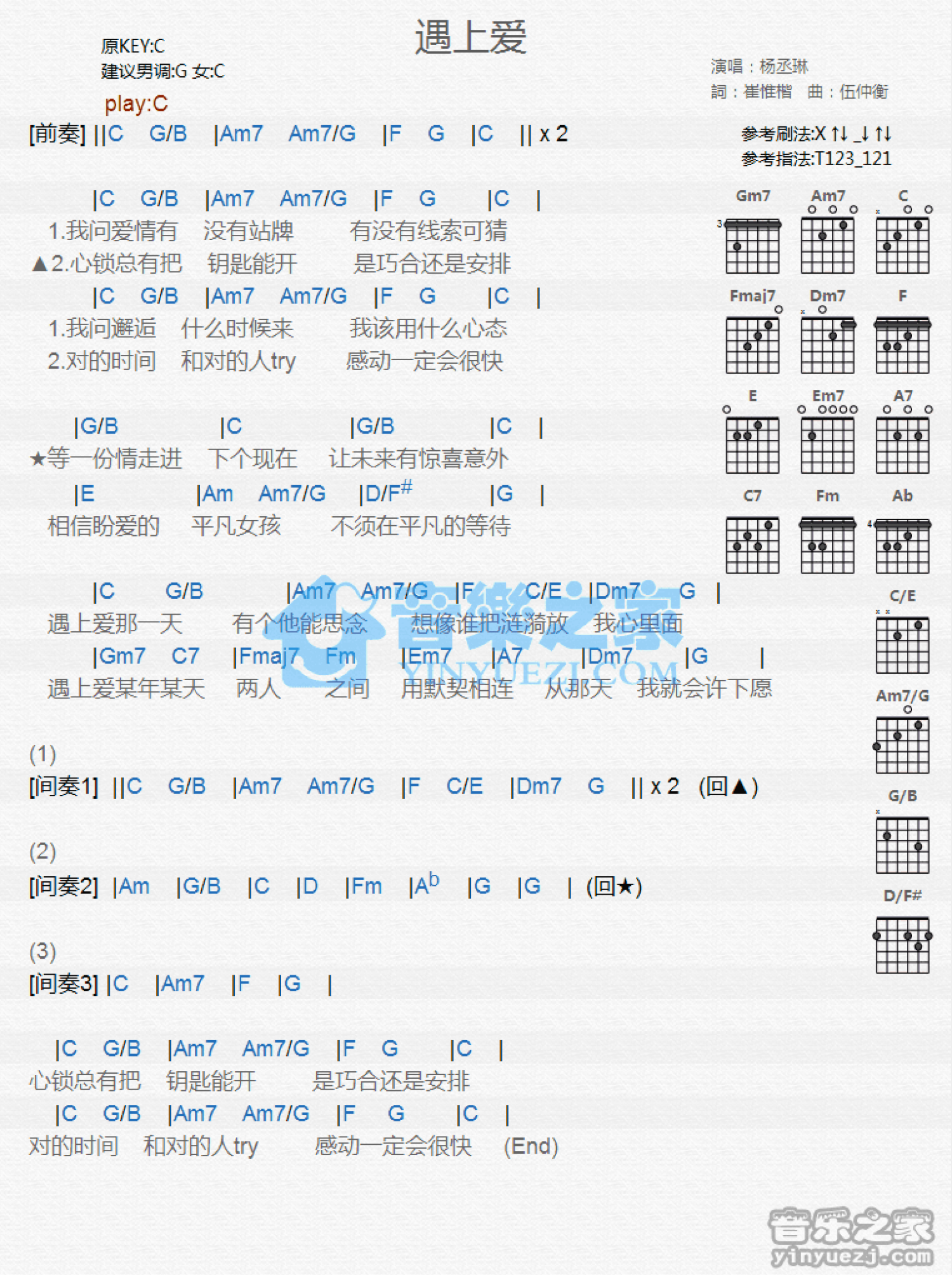 曲谱介绍: C调版杨丞琳《遇上爱》吉他和弦弹唱谱