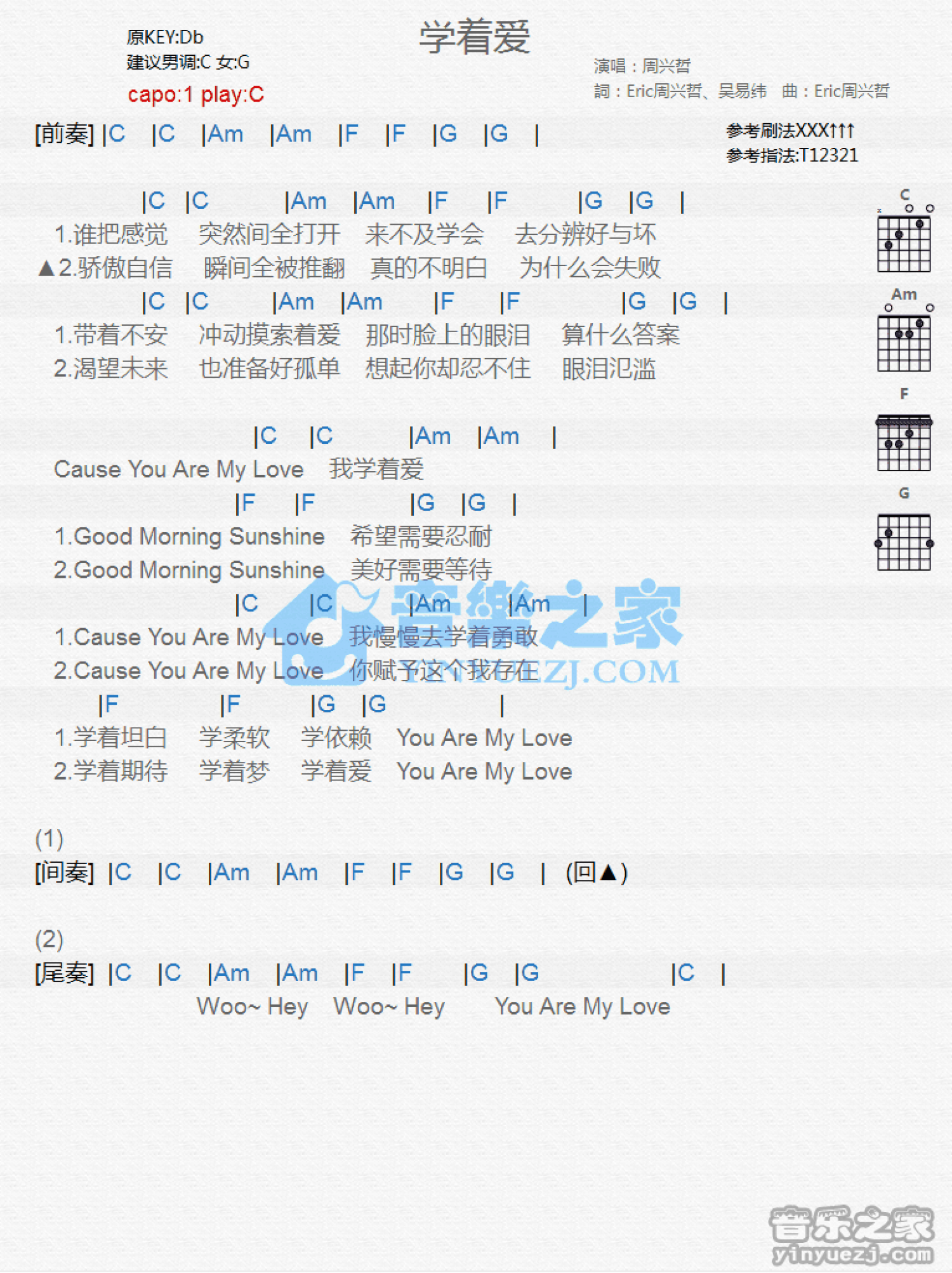 曲谱介绍: C调版周兴哲《学着爱》吉他和弦弹唱谱