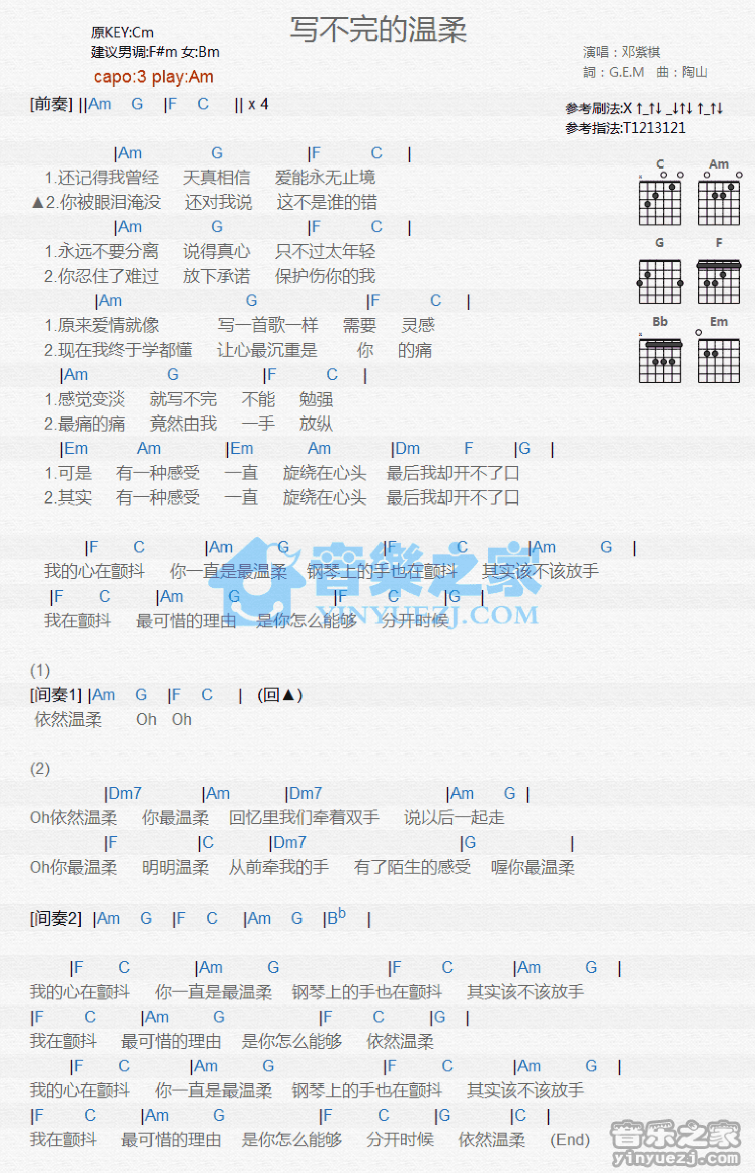 曲谱介绍: Am调版邓紫棋《写不完的温柔》吉他和弦弹唱谱