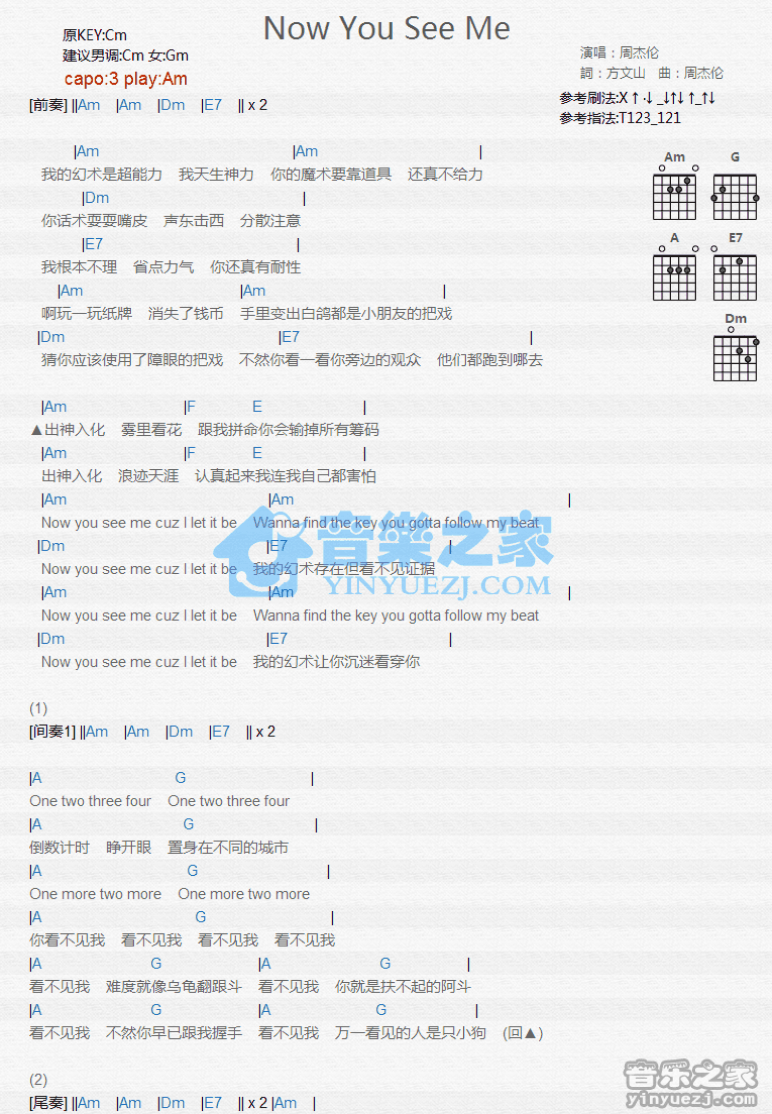 曲谱介绍: Am调版周杰伦《NowYouSeeMe》吉他和弦弹唱谱