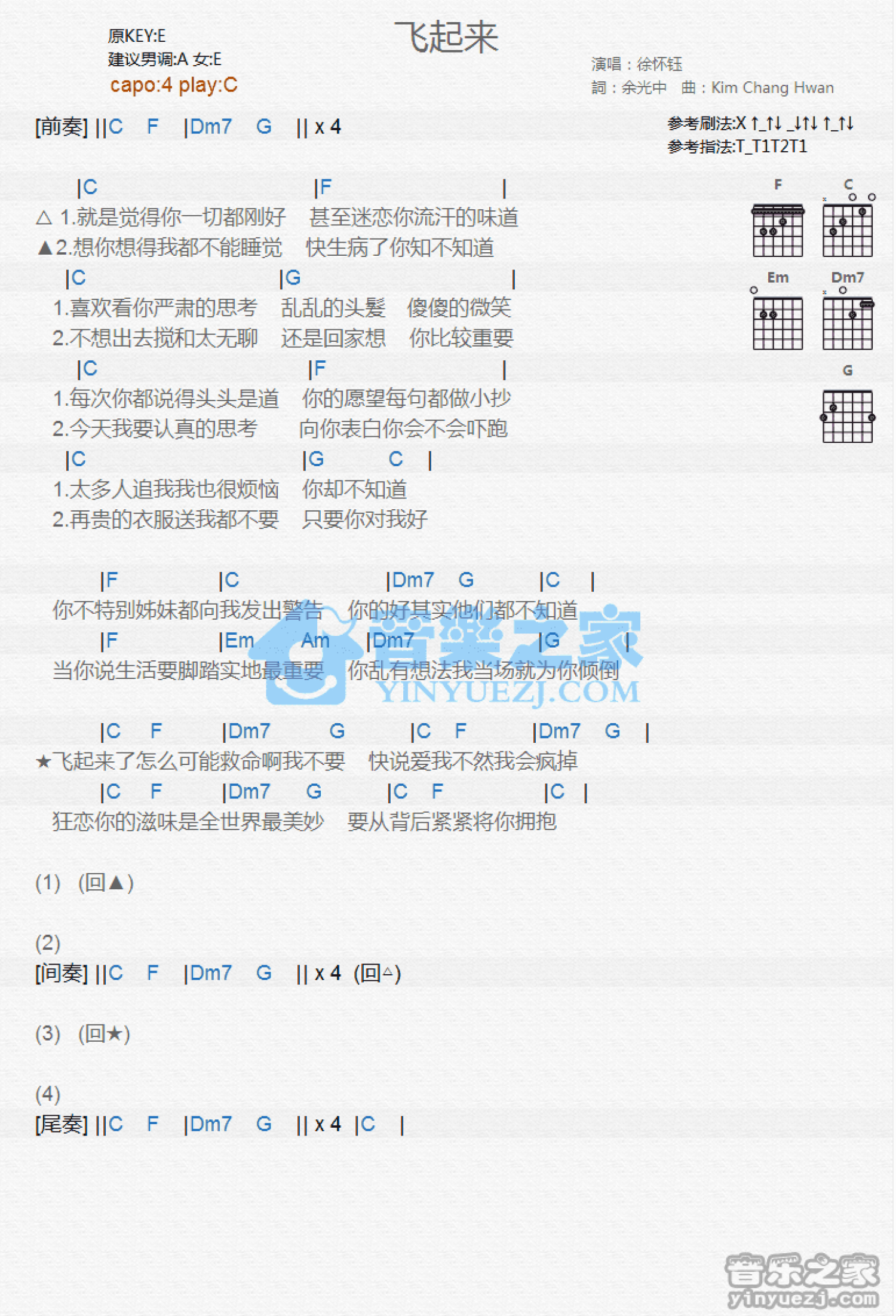 曲谱介绍: C调版徐怀钰《飞起来》吉他和弦弹唱谱
