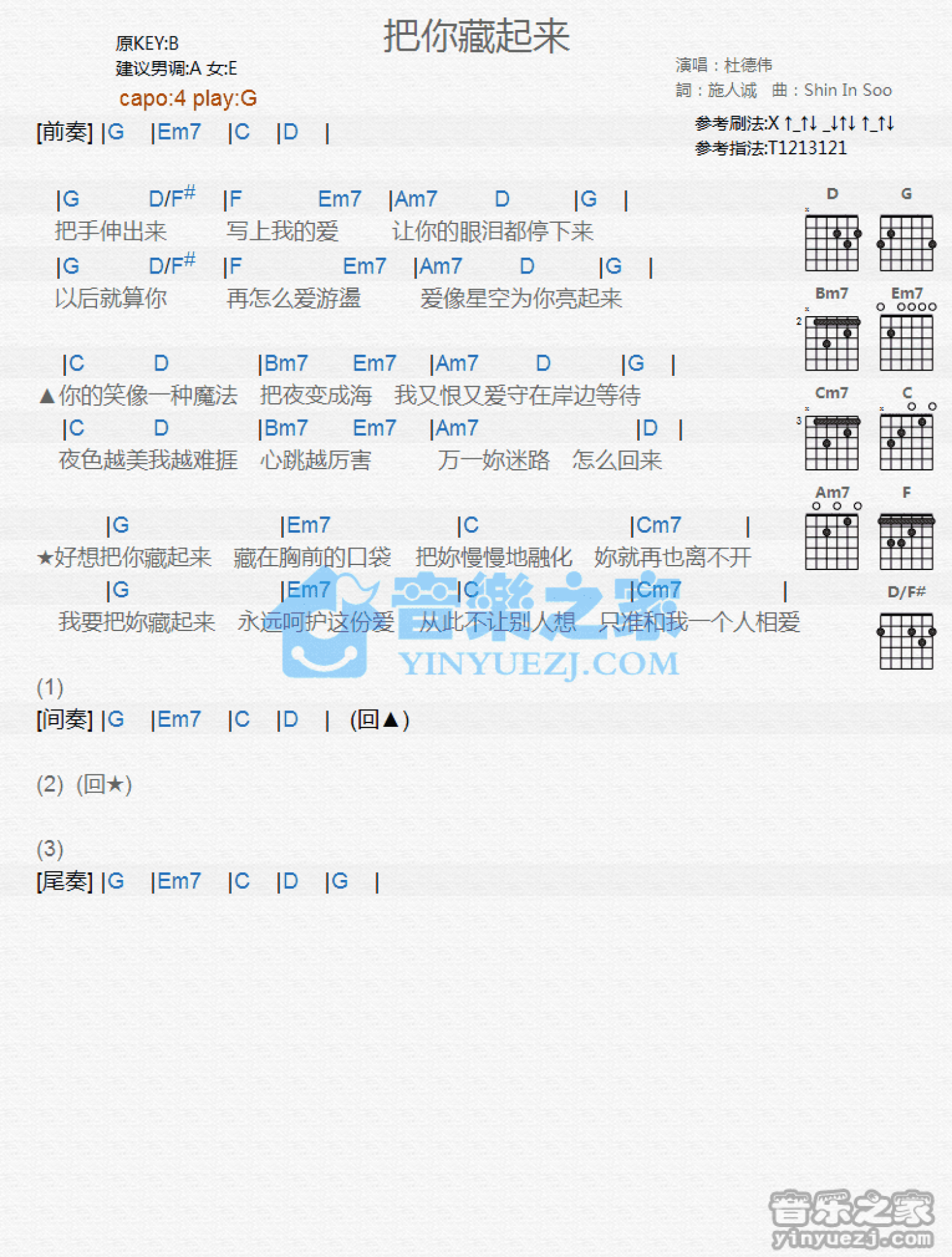 曲谱介绍: G调版杜德伟《帮你藏起来》吉他和弦弹唱谱