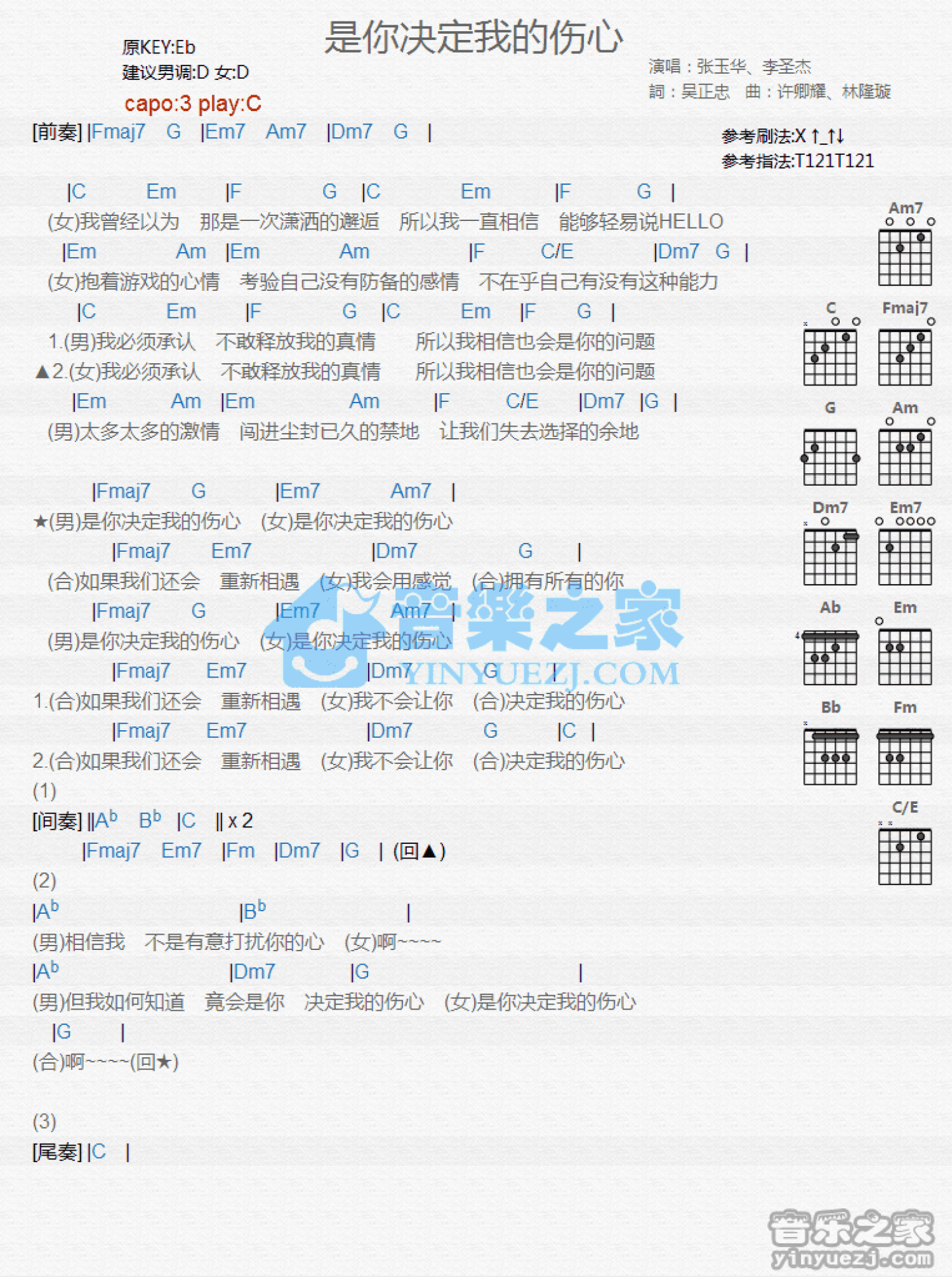 曲谱介绍: C调版张玉华/李圣杰《是你决定我的伤心》吉他和弦弹唱谱