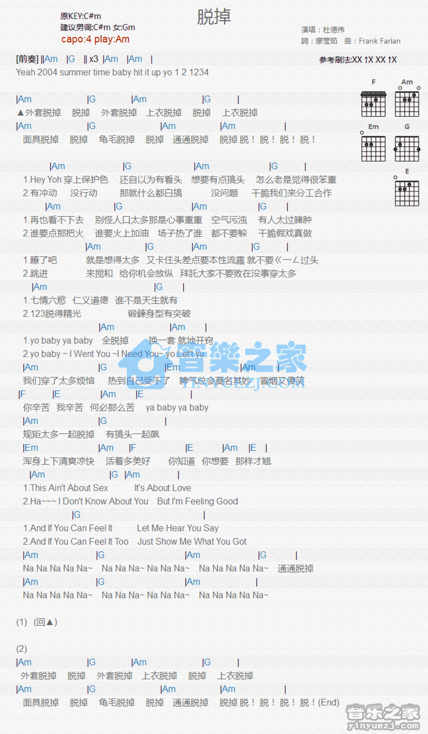 曲谱介绍: Am调版 杜德伟《脱掉》吉他和弦弹唱谱