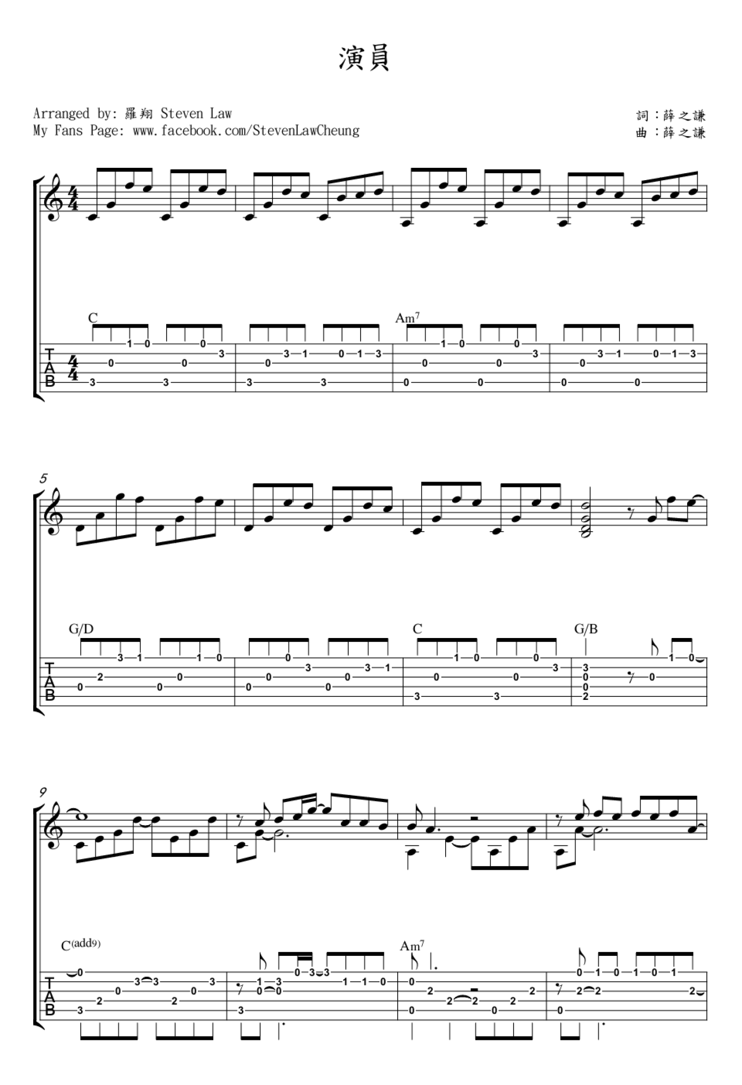 演员吉他谱 - 薛之谦 - 吉他独奏谱