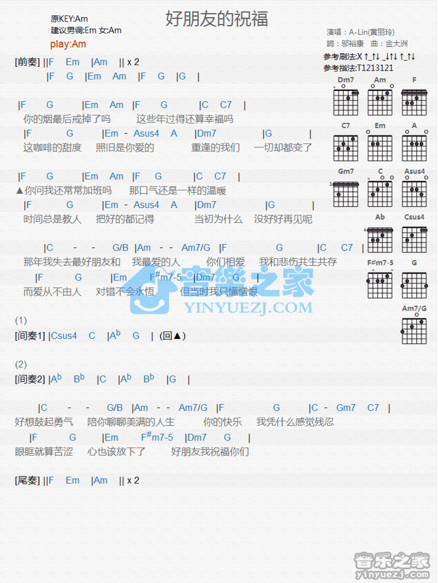 曲谱介绍: Am调版A-Lin《好朋友的祝福》吉他和弦弹唱谱