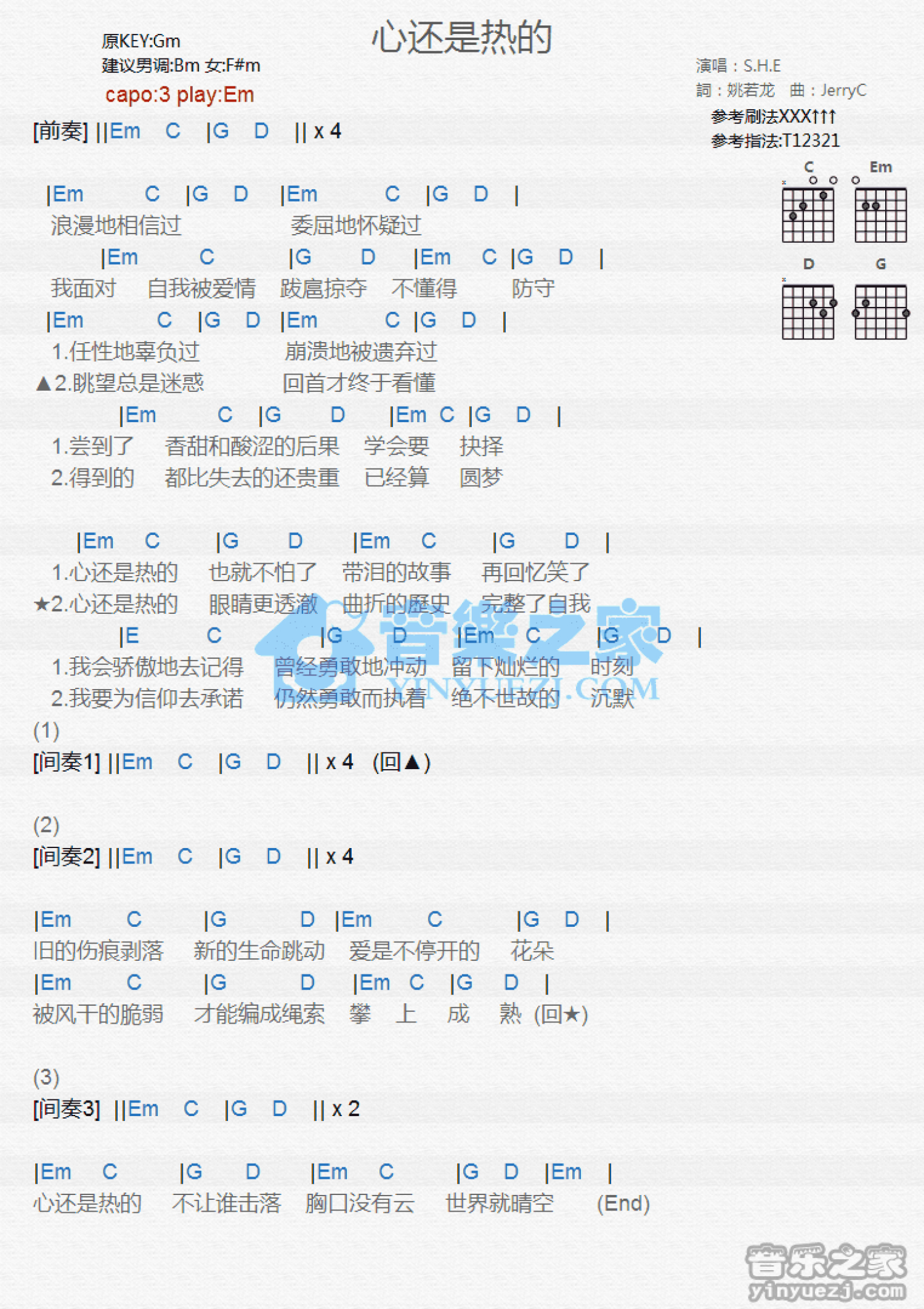 曲谱介绍: Em调版S.H.E《心还是热的》吉他和弦弹唱谱