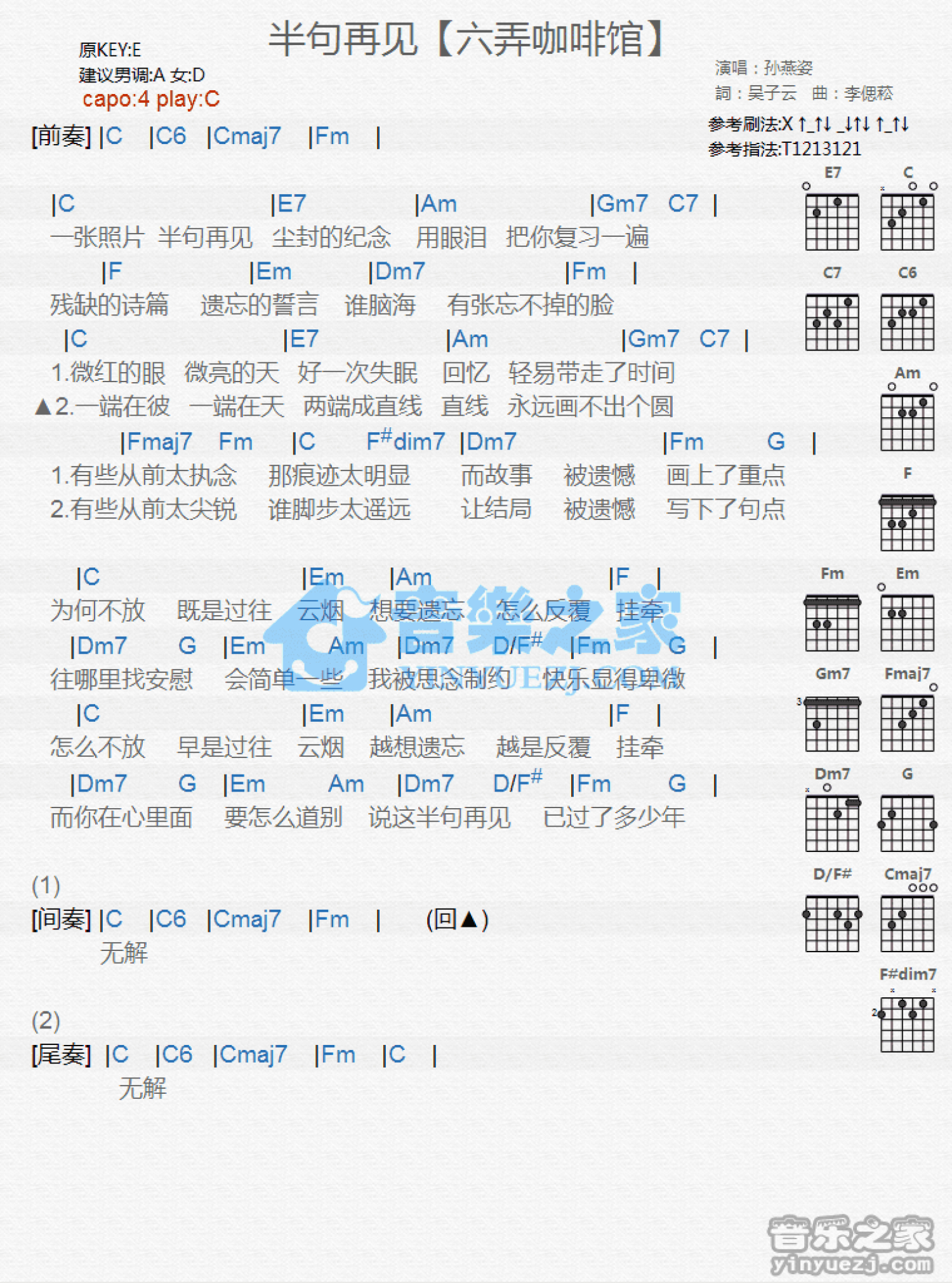 曲谱介绍: C调版孙燕姿《半句再见》吉他和弦弹唱谱