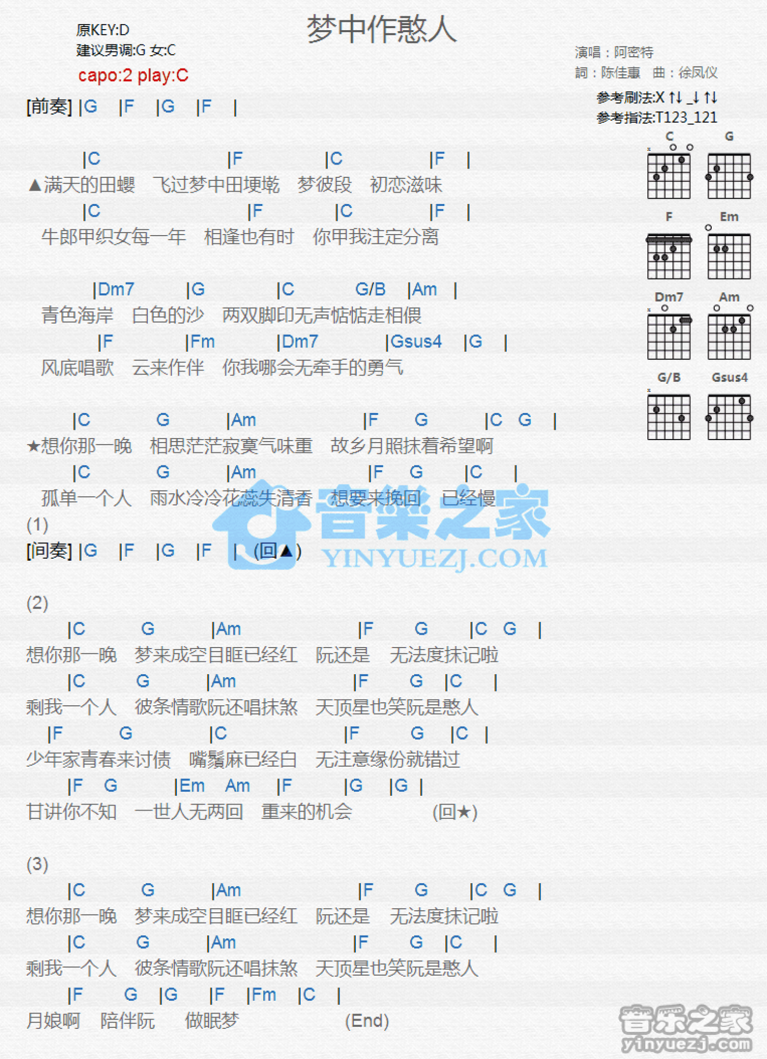 曲谱介绍: C调版《梦中做憨人》吉他和弦弹唱谱