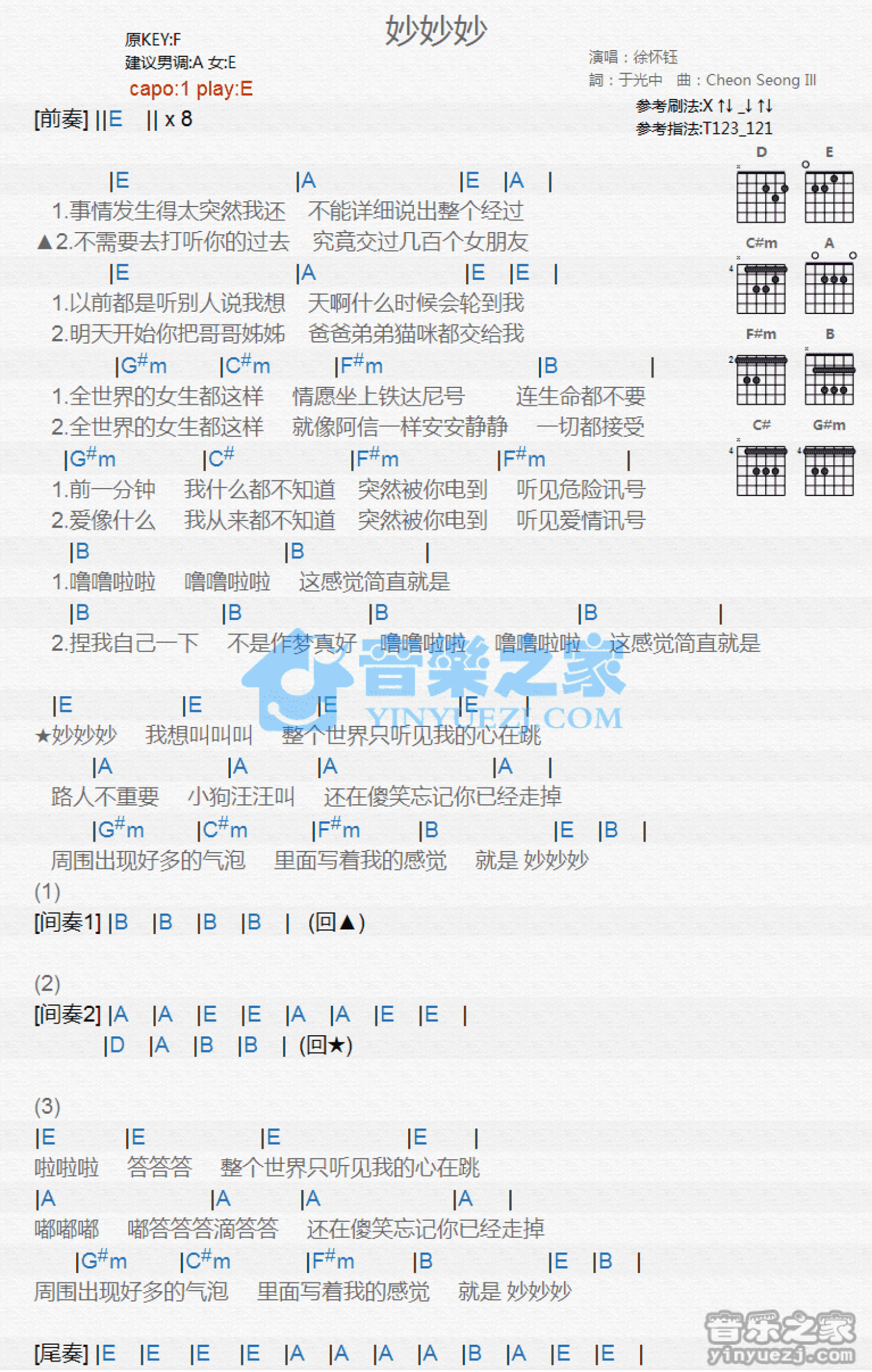 曲谱介绍: E调版徐怀钰《妙妙妙》吉他和弦弹唱谱